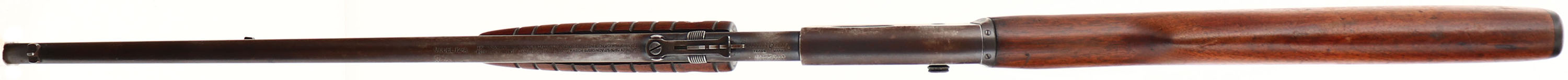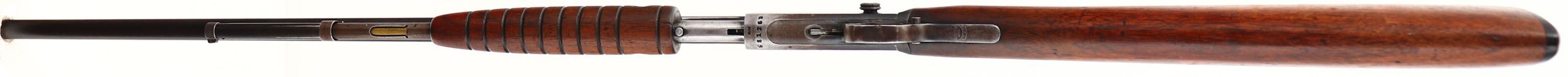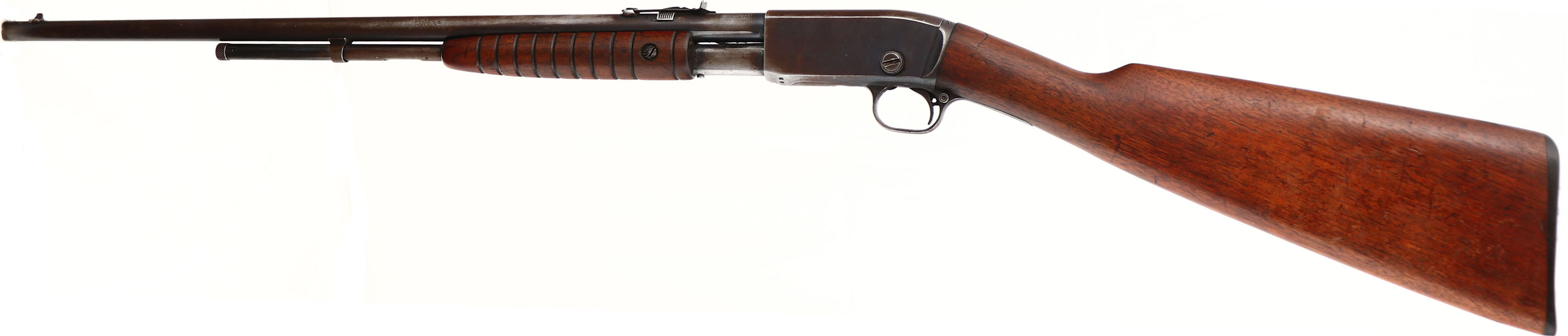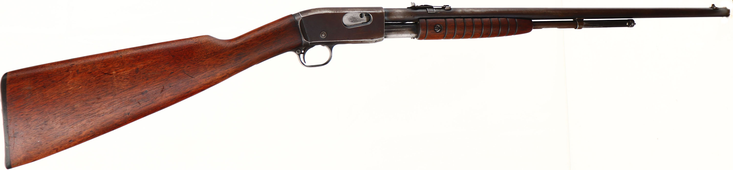 Remington, Model 12A, .22 S.L. & LR, MFG. 1909-36, SN:581269, Pump Rifle, Take-down, 22'' round barrel. The straight grip wood stocks are very good & solid, with several small scratches, nicks, contusions &.worn areas of thinning original finish. The original metal blue finish rates 20% overall, with areas of wear developing a thin brown patina. Some spots of pitting on the barrel. Fitted with an adjustable rear & standard front sights. Bore is fair. Plastic buttplate. FFL or C&R Req. - Value: 200 to 400