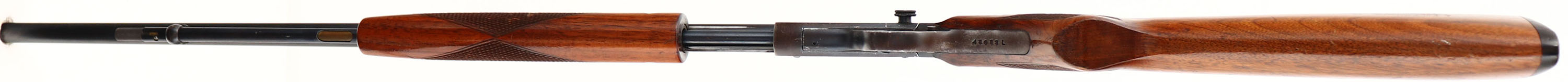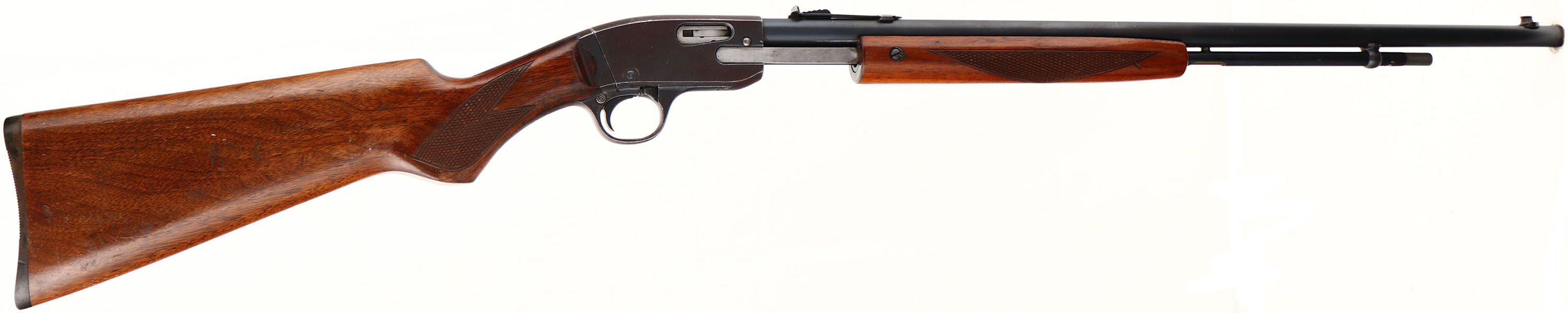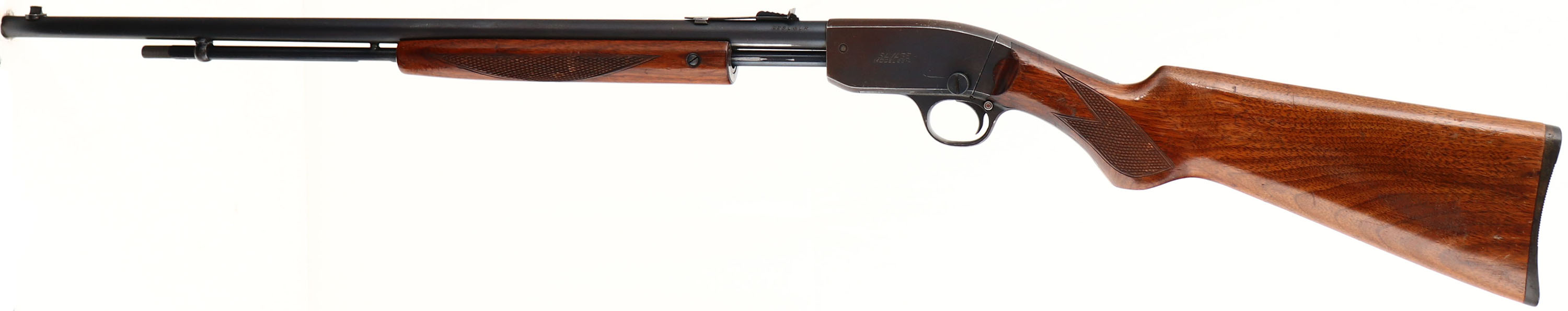 Savage Arms Corp. Model 29-A, marked .22 S. L. LR., MFG: 1948-50, SN: 48088L, Pump Action Rifle, 24'' round barrel. The original checkered & flat grip wood stocks are very good & solid, with a few minor contusions or scuffs to the original finish. The metal blue finish rates 90% on the barrel & mag, 30% on the receiver, with the balance having a brown patina. Bore is excellent. Adjustable rear & front blade sights. Factory black plastic buttplate. A good looking Savage pump. FFL or C&R Req. - Value: 250 to 500