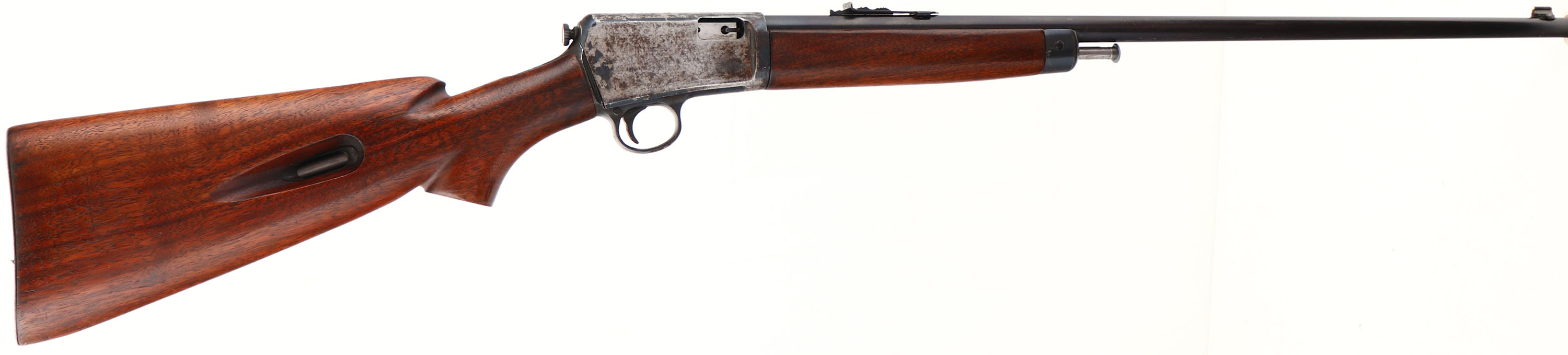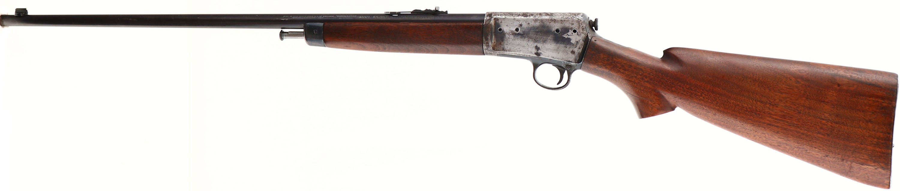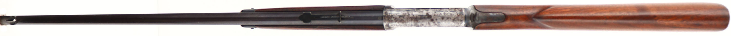 Winchester, Model 63, Marked .22 L. RIFLE SUPER SPEED & SUPER-X Cal., MFG: 1936, SN: 13801A, Semi-Auto Action Rifle, 23'' Tapered round barrel. The flat pistol grip wood stocks are very good, but the pistol grip cap is missing. There are very minor handling marks, rubs or contusions to the excellent finish. The original metal blue finish is 80% on barrel & forend cap, while the finish on the receiver has worn or been buffed mostly silver. The receiver has been drilled on the left side with 4 open holes for a previous scope mount. The trigger assembly or lower portion of the receiver carries the SN 146468. Bore is excellent. Fitted with updated front & rear sights. Checkered metal buttplate. A shooter Winchester semi-auto .22. FFL or C&R Req. - Value: 150 to 300