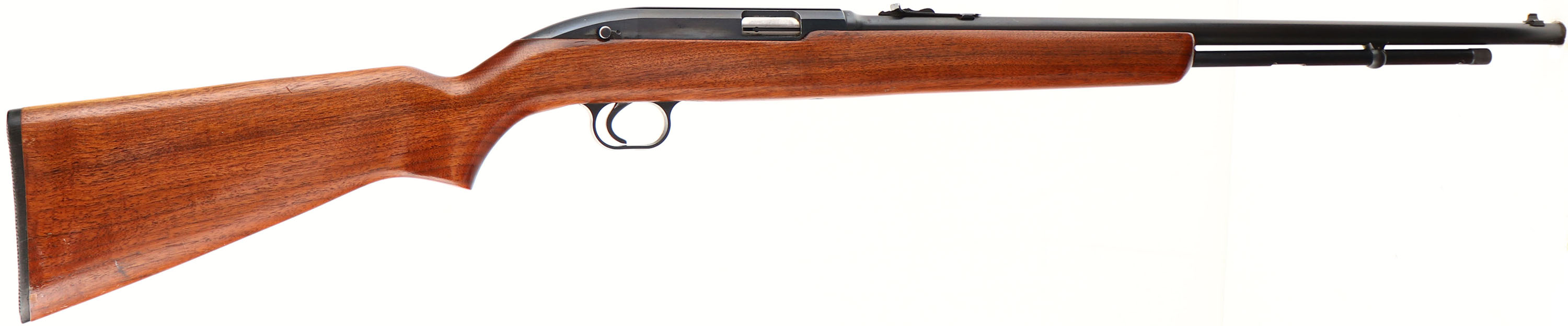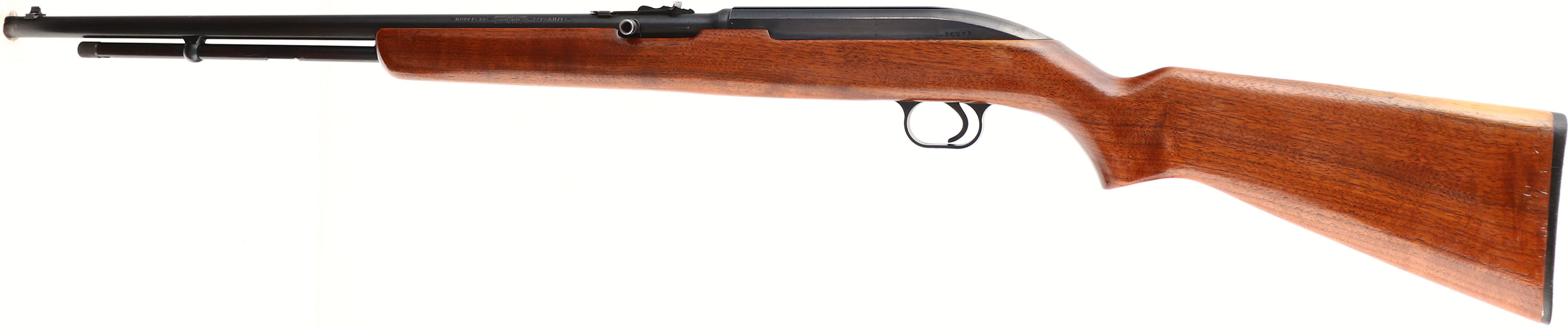 Winchester, Model 77, Marked .22 L. RIFLE Cal., MFG. 1957, SN: 66077, Tubular Mag Semi-Auto Rifle, 22'' round barrel. Original factory wood is excellent, with an added layer of finish & few small handling marks. The original metal blue finish is 95%. Bore is excellent. Factory front & rear sights. Factory plastic buttplate. A very nice looking Semi- Auto .22. FFL or C&R Req. - Value: 200 to 400