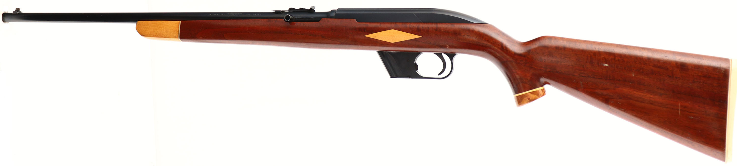 Winchester, Model 77, Marked .22 L. RIFLE Cal., MFG. 1955-62, SN: None, Detachable Mag Semi-Auto Rifle, 22'' round barrel. Grooved receiver. The custom pistol grip wood stock is excellent. The stock features a contrasting wood grip cap & forend tip. It also features matching inlayed diamonds on the sides of the stock & a red diamond shaped inlay in the pistol grip. There are several small handling marks to the excellent finish. The original metal blue finish rates 90% overall. Bore is excellent. Factory front & rear sights. Stock carries a Herters checkered plastic buttplate. Original Winchester marked detachable mag. A unique, & excellent condition custom semi-auto .22. FFL or C&R Req. - Value: 300 to 600