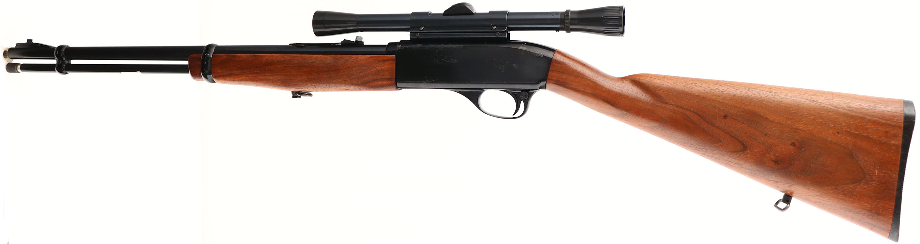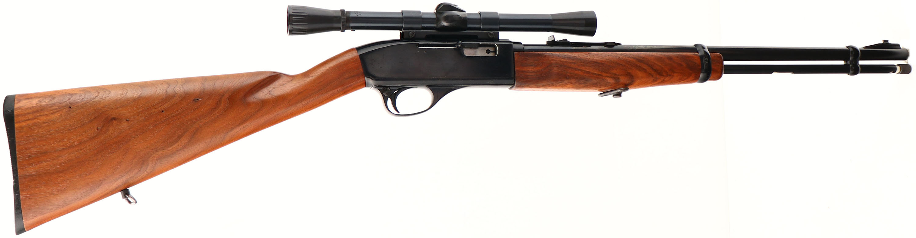 Colt, Model Colteer 4-22, .22 LR Cal., MFG. 1965-74, SN: None, Semi-Autoloading Rifle, 19'' Round barrel. Tube mag. The original straight grip wood stock is excellent & solid, with excellent original factory finish. The original metal blue finish is 90% on barrel & mag, with 85% & the Japan black finish on the triggerguard & receiver, with some scuff wear. Fitted with a Weaver .22 scope on a Weaver mount. Still retains the factory front & rear sights. Bore is excellent. Stock carries a black plastic Colt buttplate. Factory sling swivels. Mag tub plunger appears to be a replacement. FFL or C&R Req. - Value: 300 to 500