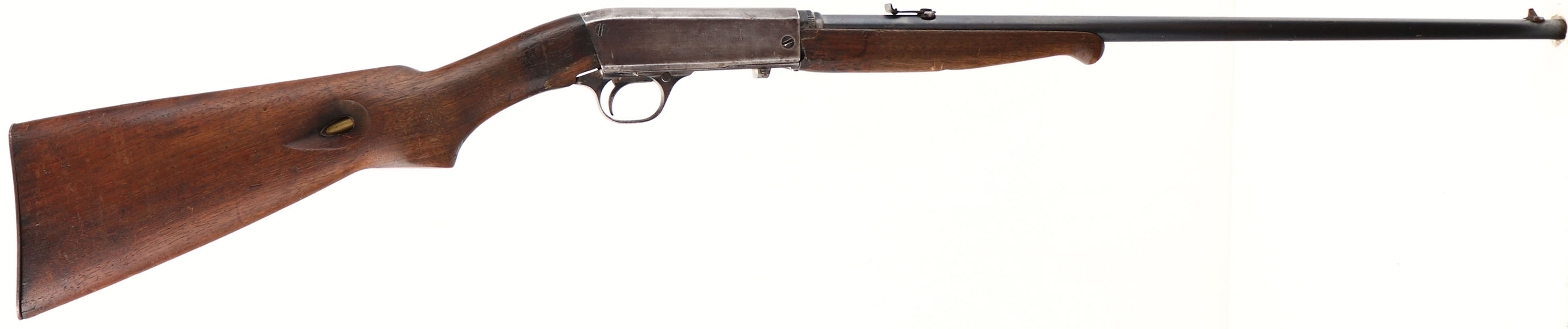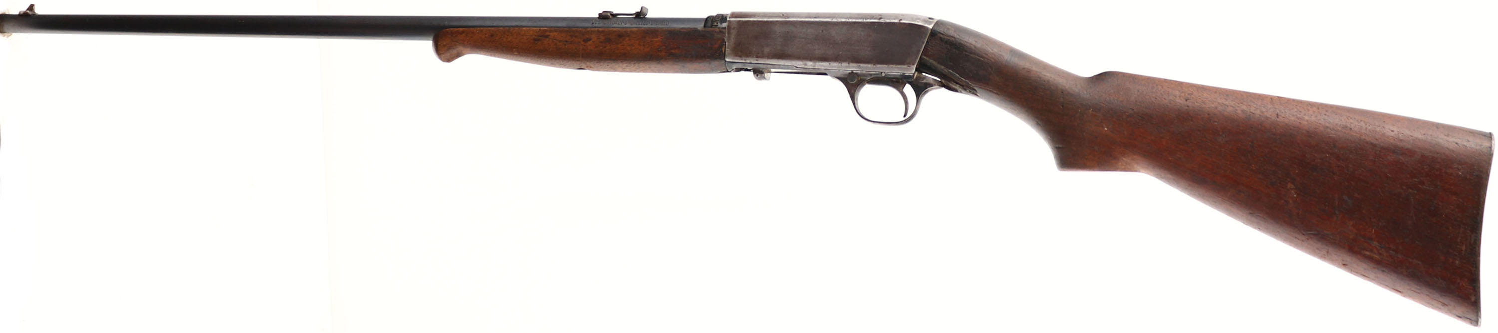 Remington, Model 24 Take-down, Marked .22 SHORT LESMOK or SMOKELESS-GREASED Cal., MFG 1922-35, SN: None, Semi Auto Rifle, 21'' Tapered round barrel. The original wood stocks are fair & still fairly solid, despite two large missing chunks from the bottom of the wrist. There are numerous scratches, scrapes & contusions. The stocks retain the original finish, although worn mostly flat with some oil staining. The original metal blue finish rates 80% on the barrel, while the receiver has fully worn & toned to a thin brown patina. Bore is excellent & bright. Original factory sights. Fitted with the original metal buttplate. FFL or C&R Req. - Value: 100 to 200