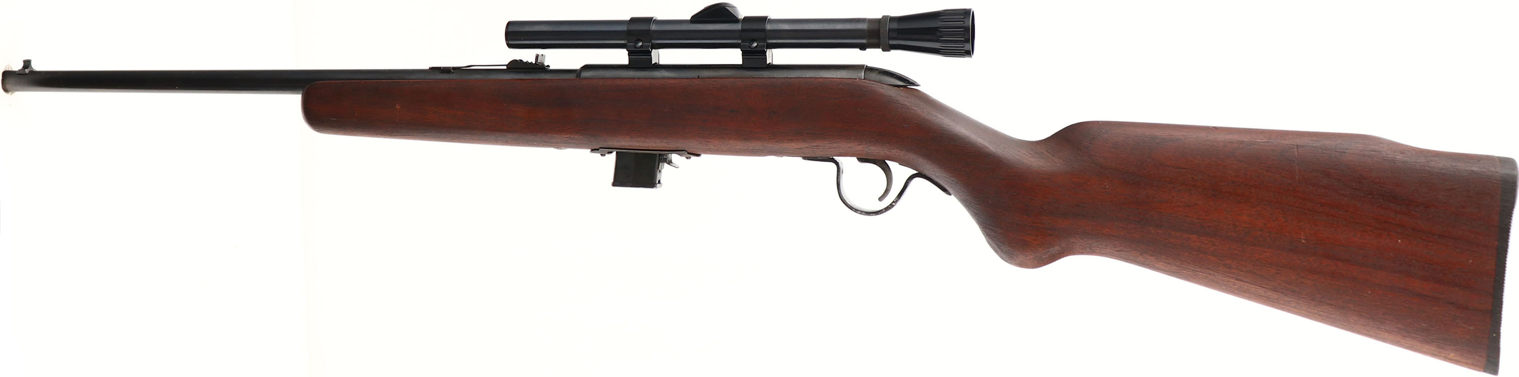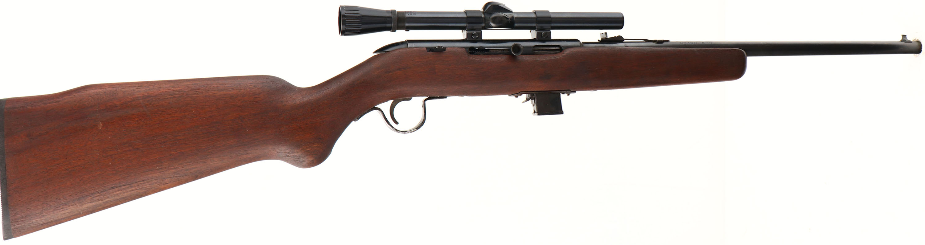 New Haven by Mossberg, Model 250C, CAL: .22 S.L.LR., MFG: 1960's, SN: None, Semi Auto, 18 1/4'' barrel. Detachable mag. New Haven is one of O.F. Mossberg & Sons' private, promotional brands. The Fajen round pistol grip Monte Carlo wood stock is very good & solid, as roughly sanded & finished. There are very few handling marks. The original metal blue finish on barrel & receiver rates 80% overall. The trigger guard has a Japan black finish. Bore is very good. The grooved receiver carries a Weaver Marksman 4X scope, while the barrel carries factory sights. Stock carries a Fajen black plastic buttplate. FFL or C&R Req. - Value: 100 to 200