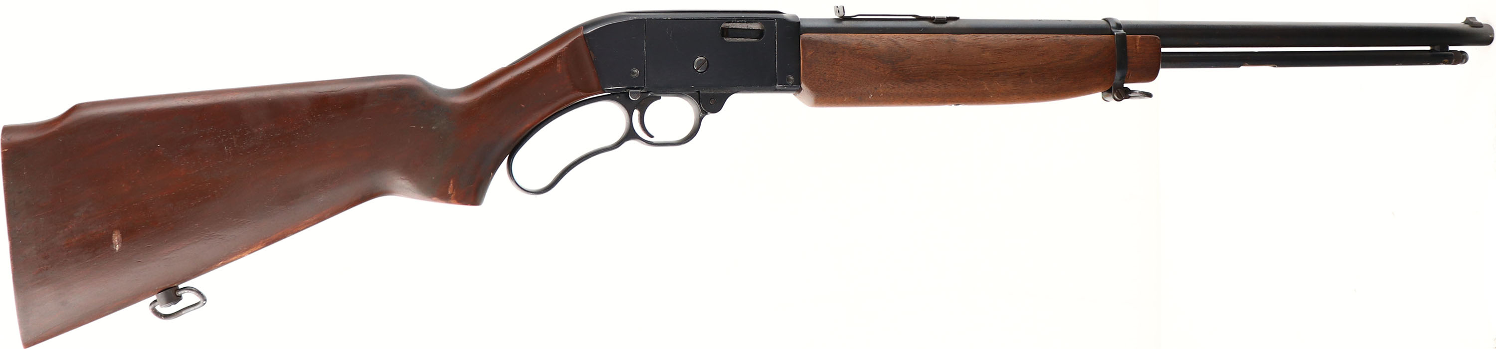 Western Field, Model M865A Carbine (Mossberg 402), marked .22 S.L.LR. Cal., MFG: 1961-71, SN: 436640, Lever Action Carbine, 20 1/4'' Round barrel, Full mag., The original wood stocks are good & solid, but someone has started a sand & refinish project on the stock that was never completed. There are a few small scratches, scrapes & contusions remaining. There is a 2'' stress crack emanating from the upper tang & running to the comb. The original factory blue finish on the barrel & mag rates 80%, but with rust speckling. The Japan black finish on the receiver rates 70%, with most of the loss on the left side from someone scrubbing it off. The barrel carries factory rear & front sights. Bore is very good. The stock is missing the buttplate. Sling loops. An interesting little boys rifle & copy of dad's carbine. FFL & C&R Req. - Value: 100 to 200