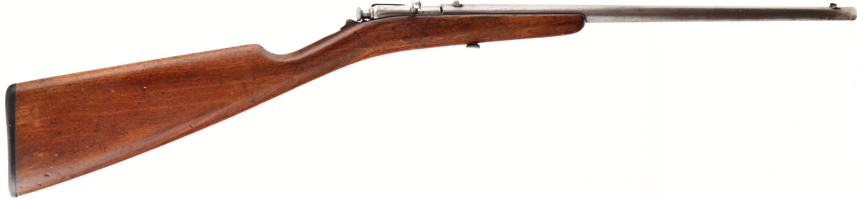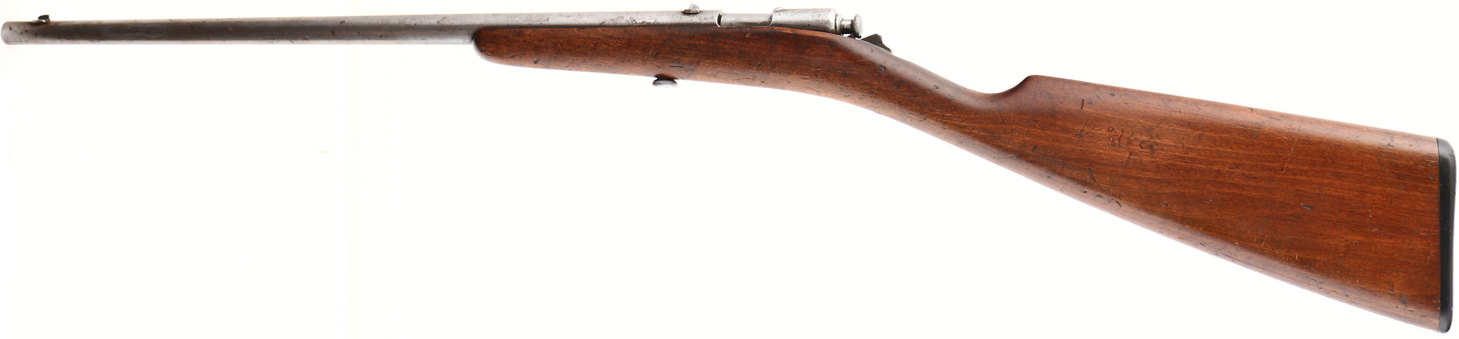 Winchester, Model 99 ''Thumb Trigger'', CAL: 22 Short & Long, MFG: 1904-23, SN: NSN, Bolt Action Rifle, 18'' barrel. The original straight grip wood stock is very good & solid, having been lightly sanded & refinished, but still with numerous minor contusions, scratches & scrapes remaining. There is a 2'' repaired slice of wood along the stock edge under the bolt handle. There are also a few initials scratched into the left side of stock, which are still visible after attempt to fill during stock refinish. The metal blue finish has fully worn or been polished gun metal gray. Bore is fair to poor, with scarring & pitting amongst some visible rifle. The barrel holds a standard notch dovetail rear & blade front sights. Stock carries the original plastic buttplate, with engraved screws. Many of these were shipped to Australia & South America, making them less common in U.S. & generally sought by collectors when in presentable surviving condition such as this example. FFL or C&R Req. - Value: 200 to 400