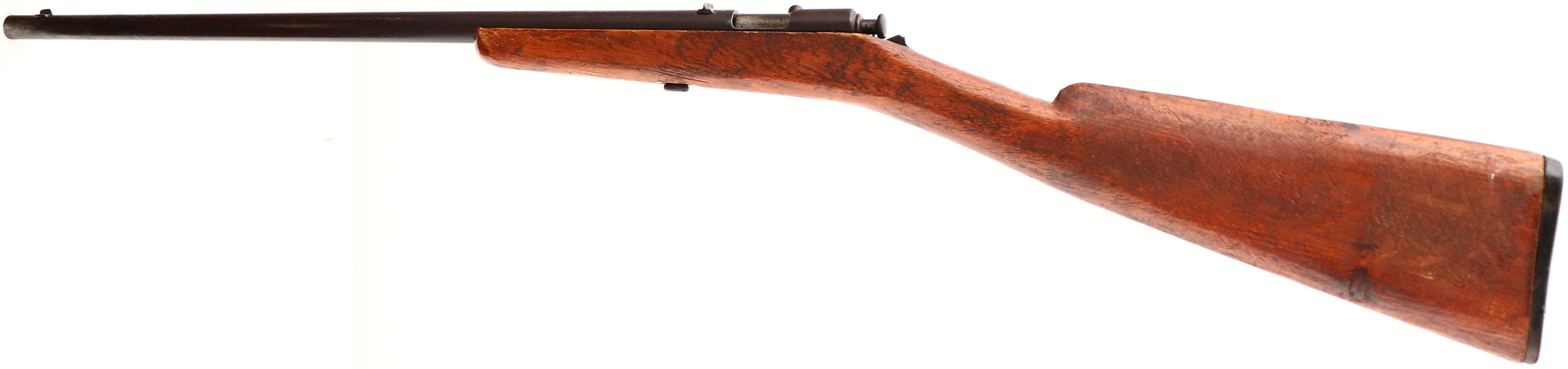 Winchester, Model 99 ''Thumb Trigger'', CAL: 22 Short & Long, MFG: 1904-23, SN: NSN, Bolt Action Rifle, 18'' barrel. The straight grip wood stock is solid but a fairly rough cut replacement. The stock was not fully sanded smooth before finishing & there are also several contusions, scratches & scrapes. The metal blue finish has fully toned to a brown patina. Bore is fair to poor, with scarring & pitting amongst some visible rifle. The barrel holds a standard notch dovetail rear & blade front sights. Stock carries the original plastic buttplate, with engraved screws. FFL or C&R Req. - Value: 100 to 200