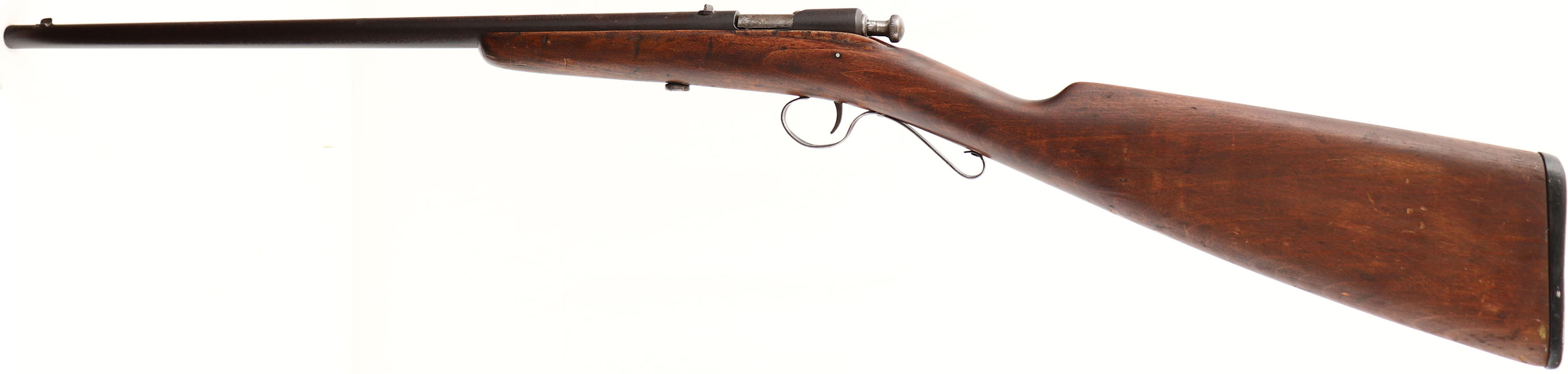 Winchester, Model 1902, CAL: 22 Short, Long & Ex Long, MFG: 1902-31, SN: NSN, Bolt Action Rifle, 18'' barrel. The original straight grip wood stock is very good, but does have an edge repair on both sides of the stock along the receiver. The right side has a 1 1/2'' missing chunk still. There are also minor contusions, scrapes & dings to the original finish. The metal finish has worn to a plum/brown patina, with spotting & speckling. Bore is fair, with roughness & pitting amongst some visible rifling. The barrel holds a factory rear & small blade front sights. Stock carries the original worn hard rubber buttplate, with engraved screws. ''S'' shaped trigger guard. FFL or C&R Req. - Value: 100 to 300