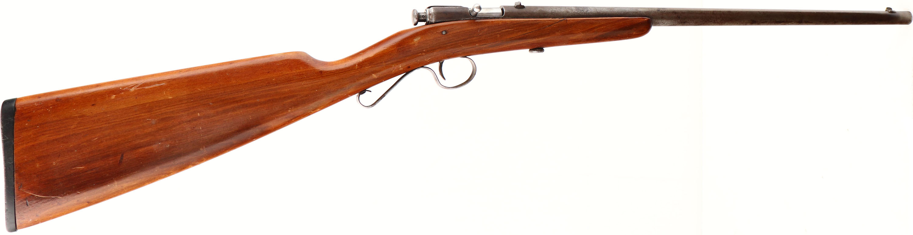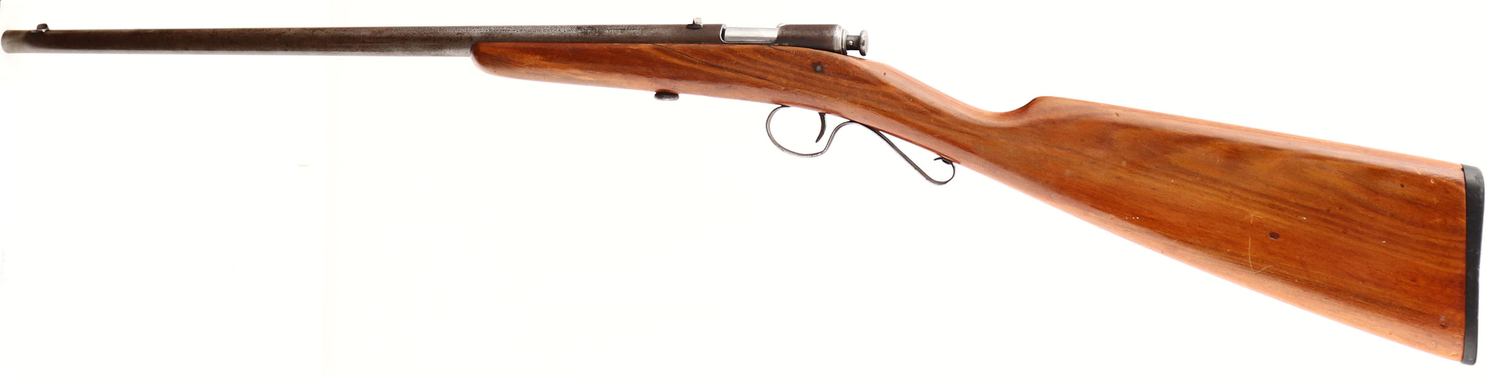 Winchester, Model 1902, CAL: 22 Short, Long & Ex Long, MFG: 1902-31, SN: NSN, Bolt Action Rifle, 18'' barrel. The original straight grip wood stock is good & solid, after having 5'' stress cracks glue repaired & then sanded & refinished. The stock still has minor contusions, scrapes & scratches to the high gloss finish. The metal finish has worn mostly gun metal gray, with a thin brown patina. Bore is good, but with roughness & pitting amongst some worn thin rifling. The barrel holds a factory rear & small blade front sights. Stock carries the original worn hard rubber buttplate, with engraved screws. ''S'' shaped trigger guard. FFL or C&R Req. - Value: 150 to 300