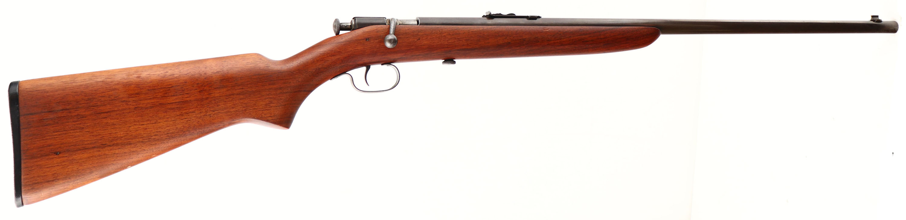 Winchester, Model 60, Early Variation, .22 S.L.& LR. Cal., MFG. 1930-32, SN: None, Bolt Action Rifle, 23'' Tapered round barrel. Single shot. An improved Model 59, This 23'' round barrel was produced in the first 2 yrs, later barrels were increased to 27'' for the last 2 yrs. The original flat pistol grip wood stock is excellent, as lightly sanded & nicely refinished. There are very few light scuff or handling marks. The metal finishes have toned to a thinning brown patina. Bore is excellent. Original Winchester buttplate, with finish over it. Factory sights. A collectible early example. FFL or C&R Req. - Value: 250 to 500