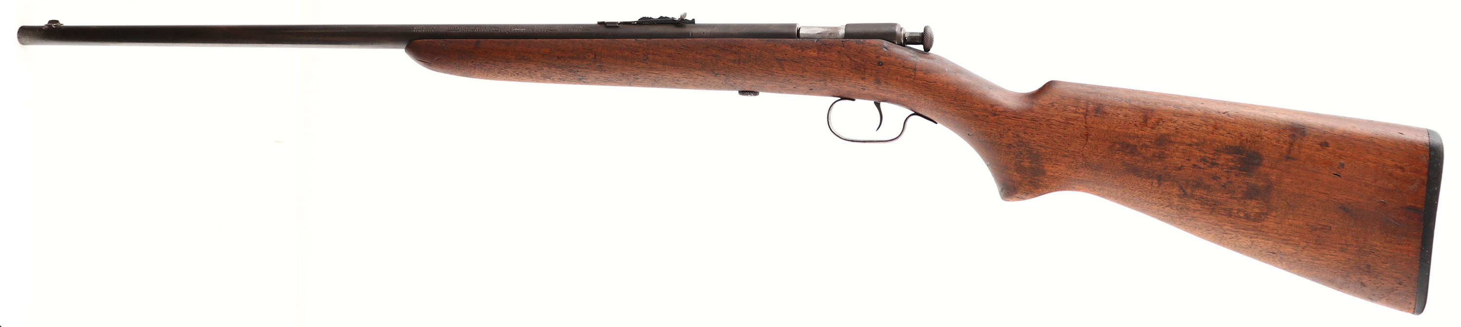 Winchester, Model 60, Early Variation, .22 S.L.& LR. Cal., MFG. 1930-32, SN: None, Bolt Action Rifle, 23'' Tapered round barrel. Single shot. An improved Model 59, This 23'' round barrel was produced in the first 2 yrs, later barrels were increased to 27'' for the last 2 yrs. The original flat pistol grip wood stock is good numerous small scratches, scrapes & contusions. The original finish has mostly worn from use & wear. The metal finish is an applied thin gray finish. Bore is good. Original Winchester buttplate. Factory sights. FFL or C&R Req. - Value: 150 to 300
