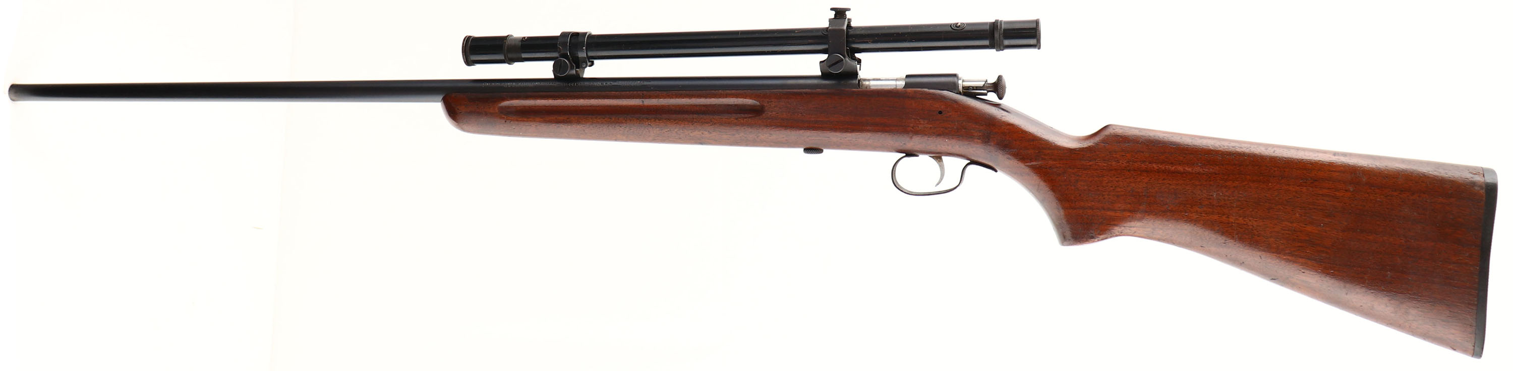 VERY RARE Winchester, Model 677 (Scoped Rifle), .22 W.R.F. Cal., MFG. 1937-39, SN: None, Bolt Action Rifle, 27'' Tapered barrel. Although the barrel is marked ''67'' it is a rare model 677 rifle with no factory provisions for open sights. Winchester sold the British Government scoped Models 67, 677, 69 & 697 rifles, to be used as military training rifles. The Model 677 & 697 rifles were in .22 S.L.or LR. Or WRF Cal., with scopes & no provisions for open sights. The Model 67 & 69 stamped rifles were in .22 S.L.LR. Cal. & fitted with the same scopes, but also with open sights. This is one of the rare Model 677 rifles, without sights & with the proof stamped moved from the top flat to the left side to accommodate the factory mounted scope. This is one that was built for the U.S. market & was not sent over to the British Government. The original pistol grip & early rare finger grooved forend wood stock is excellent & solid. It displays the majority of the original finish, with finish level minor scratches, scuffs & contusions. The metal blue finish on the barrel & receiver is retained at 98% coverage. Finish on trigger guard has thinned to a thin brown patina. Bore is excellent & bright. Rifle is factory fitted with a Winchester scope on Winchester scope rings & blocks. The scope does have minor finish scratches on the tube. Again, the barrel has no sight provisions, which is factory for this model 677. Nickel bolt handle & trigger. The ''Winchester'' marked buttplate is also excellent. Only 2,240 produced. A very rare rifle with collectible optics. Highly sought after & collectible! FFL or C&R Req. - Value: 1500 to 2500