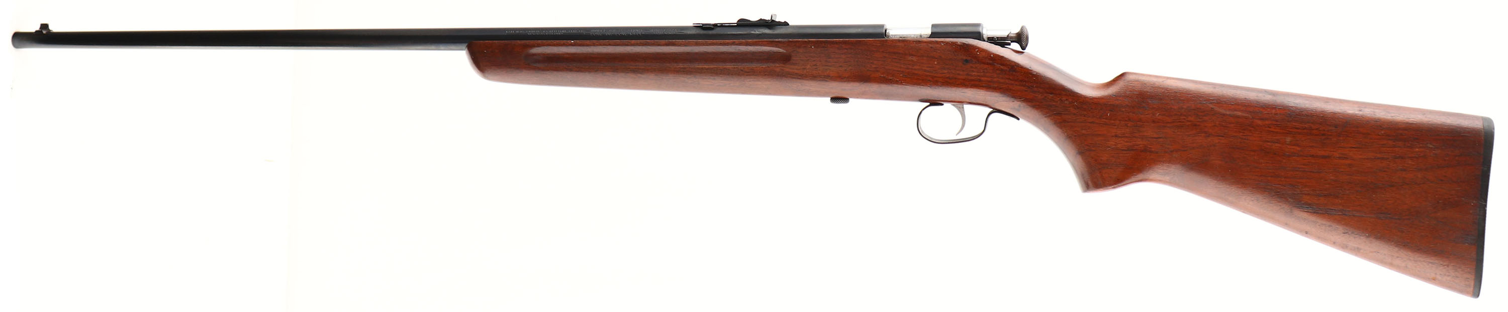 Winchester, Model 67 Sporting Variation, CAL: 22 S.L.LR, MFG: 1934-36, SN: N/A, Take-down Bolt Action Rifle, 27 1/8'' Sporting tapered barrel. This is an early 1st issue with the slim, grooved forend & raised take-down screw. The original flat pistol grip wood stock is excellent, with some minor handling marks to the original finish. The original metal blue finish rates 95% overall, with the trigger guard toning to a brown patina. The barrel holds an adjustable rear & blade front sight. Bore is excellent & bright. Buttstock carries a Winchester checkered black plastic buttplate. Nickeled bolt, bolt handle & trigger. A very nice appearance on this early production Sporting model. FFL or C&R Req. - Value: 300 to 600