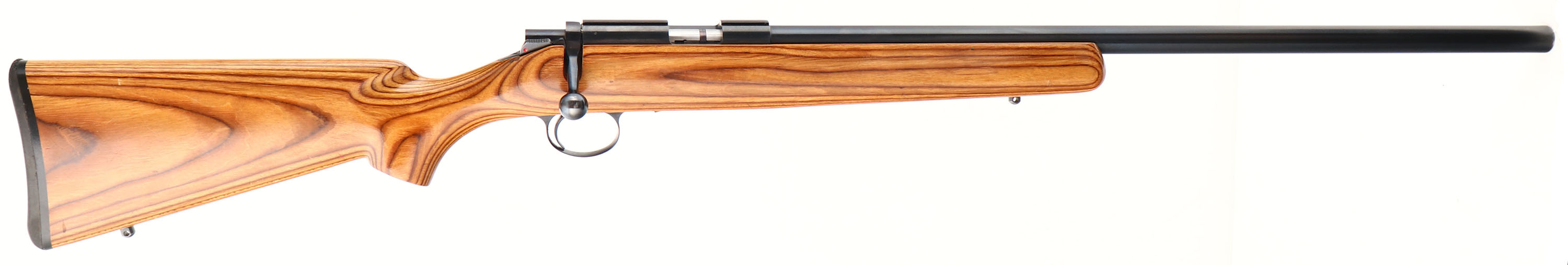 Kimber of Oregon. Model 82, CAL: 22 S.L.LR, MFG: 1978-91, SN: 820425, Bolt Action Rifle, 25'' Bull barrel. The original flat pistol grip laminated wood stock is excellent, but with several minor scrapes, scratches & contusions to the original finish. The metal blue finish rates 95% overall, with some light speckling. Bore is excellent & bright. The receiver is grooved for future scope mounting, while the barrel has no open sight provisions. Comes with a set of scope rings. Buttstock carries a Kimber thin rubber recoil pad. Sling studs. An excellent example. FFL Req. - Value: 500 to 1000