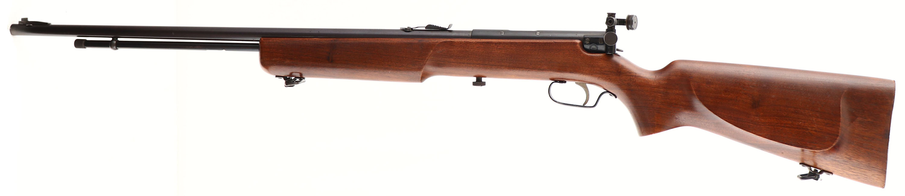 Mossberg, Model: 46A, Cal: .22 S.L.LR, MFG: 1938-39, S/N: None, Bolt action rifle, 26'' barrel. The cheeked & flat pistol grip, walnut stock is excellent, with only a couple minor contusions or marks to the original finish. The original metal blue finish has almost full coverage (90%), but the barrel is starting to tone plum/gray. The bore is excellent. The receiver is fitted with a fully adjustable Mossberg marked peep sight, while the barrel holds a U-notch leaf rear & a wide blade front sights. The stock carries a grooved, blued steel buttplate. Sling loops. Excellent overall. FFL or C&R Req. - Value: 300 to 600