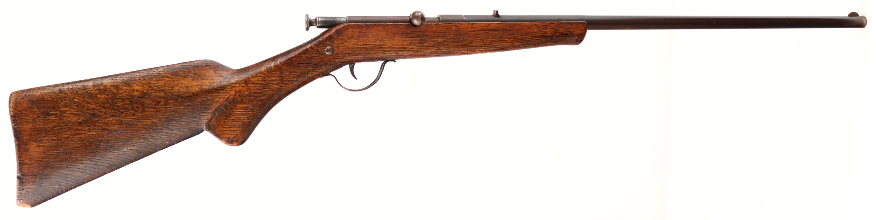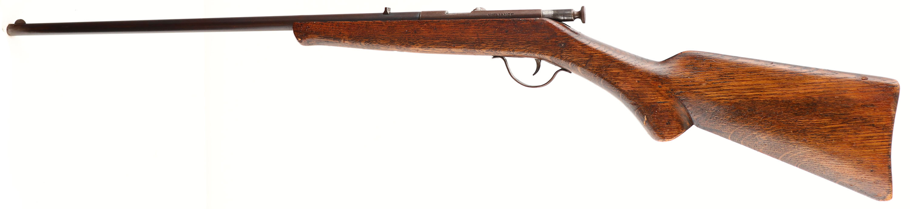 Page-Lewis, Reliance - Model D, CAL: 22 LR, MFG: 1920's, SN: NON, Bolt Action Rifle, 20'' barrel. The pistol grip wood stock is fair. There is large crack on the right side of the stock from the back of the receiver to the take-down screw, that has an attempted repair with a screw. There is a edge chip at the toe, multiple scratches, scrapes, dings & added finish. The metal blue finish on the barrel has toned to a brown patina, with blue undertones. The receiver has fully worn to metal gray, with toned brown patina. Bore is good. Fixed rear sight & blade front sight. Correctly has no buttplate. FFL or C&R Req. - Value: 50 to 100