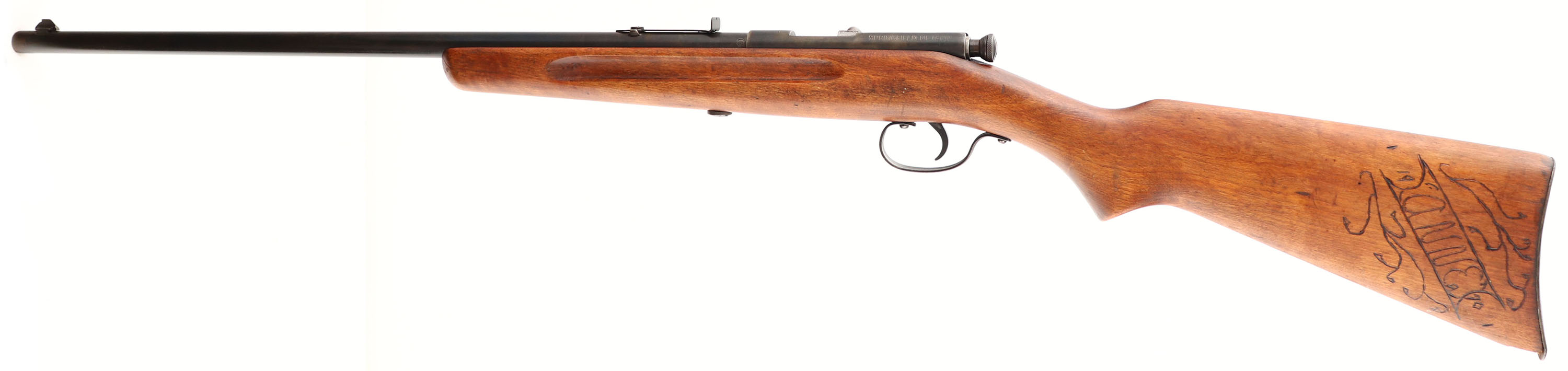 J. Stevens, Springfield, Meteor Model 52-A, CAL: .22 S,L,LR, MFG: 1929-47, SN: NONE, Bolt Action Rifle, 22'' barrel. The flat pistol grip wood stock is good & solid. The stock has been hand carved on both sides. The left side is marked ''ANNE 1970'' with a decorative border. The right side is carved ''AC 1970'' & ''WILLY 1974'' both with decorative borders. The metal blue finish on the barrel rates 50%, toning to a brown patina as it thins. Bore is good. Adjustable rear sight (missing elevator) & blade front sight. Smooth metal buttplate. The bolt stop on the sear is broken. We recommend repair by a gunsmith before utilizing. Sold ''AS-IS'' with no returns. FFL or C&R Req. - Value: 40 to 100