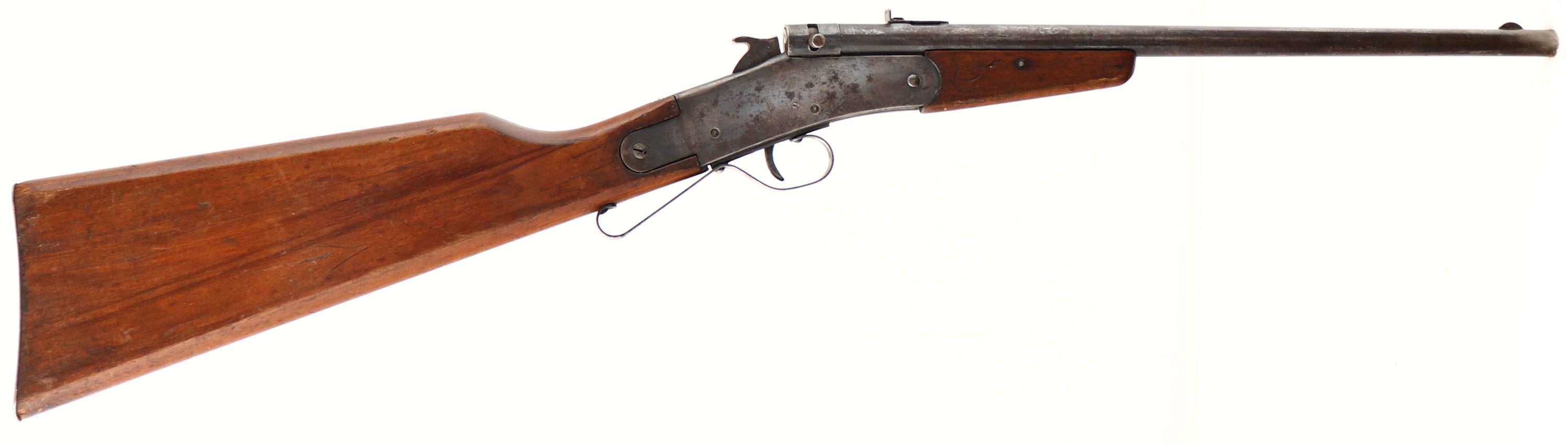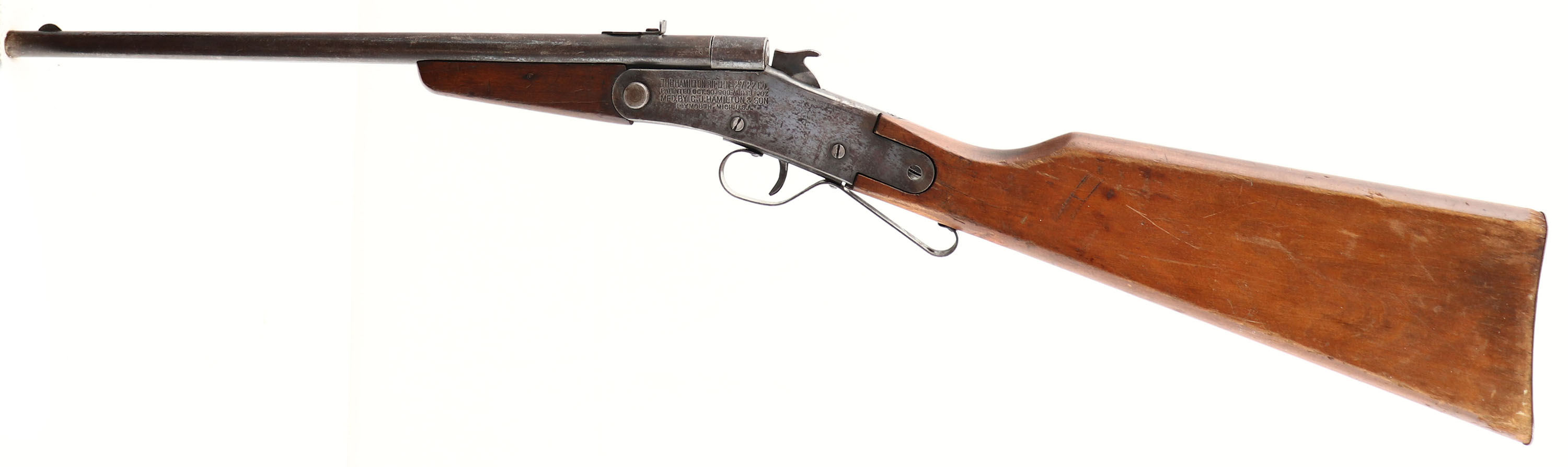 The Hamilton Rifle Co. Model 27 (Tip-up Model), 22 CAL (S. & L.), MFG: 1907-30, SN: NONE, Single Shot, Tip-up Break Action Rifle, 14 7/8'' round barrel. 29 1/2'' overall length. The flat board, straight grip, walnut stained birch stocks are good & solid, despite two 2'' stress crack to the left side of wrist & one on the right side. The letter ''H'' is thinly scratched onto left side of stock. They carry the original finish, which is thinning from use & display a variety of scratches, dings & edge wear. The original metal blue finish has toned mostly to a brown patina, with some remnants of blue on receiver. Metal has speckled rust & a few abrasions on the receiver. Steel rolled barrel over brass bore liner, 6 groove bore with 1 turn in 15''. Bore is fair, with some rifling remaining amongst roughness. Half moon blade front & early rear sight combination. ''S'' shaped trigger guard. Original steel buttplate. FFL or C&R Req. - Value: 100 to 250