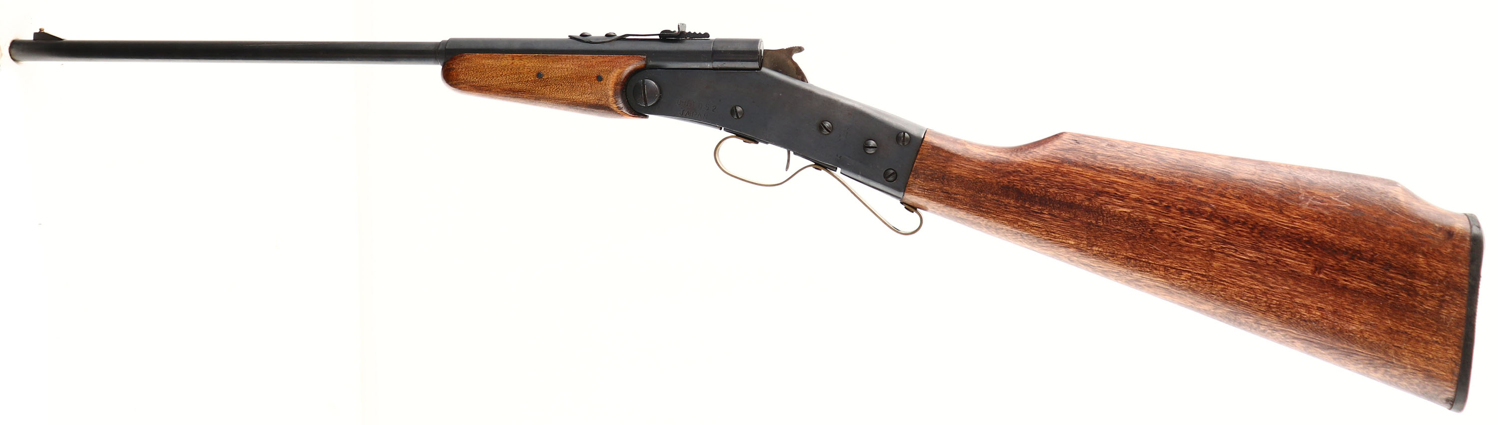 Sierra Arms Co., A Japanese version of the Hamilton Rifle (Model 027), .22 LR, MFG 1965, SN: 001052, Break single shot rifle. 17.5'' Round barrel. A California import companies version of the Hamilton model 027 from Japan. They were not very successful as many dealers thought they were too cheaply made to withstand the .22 LR caliber they marketed to fire. They closely resembled the Hamilton 027, but they carried a walnut stained Monte Carlo shaped stock, had a longer step-down barrel, a brass trigger guard, & were fitted with an adjustable rear sight & more substantial front sight. The action remained the same, as did the brass barrel liner. The stocks on this example are very good & solid. The stocks appear to have the original finish, with an added coat of finish. The stocks display minor scuffs, scrapes or handling marks. The original metal blue finish rates 90%. Bore is very good. Barrel carries original sights. Original rubber buttplate. FFL or C&R Req. - Value: 125 to 250