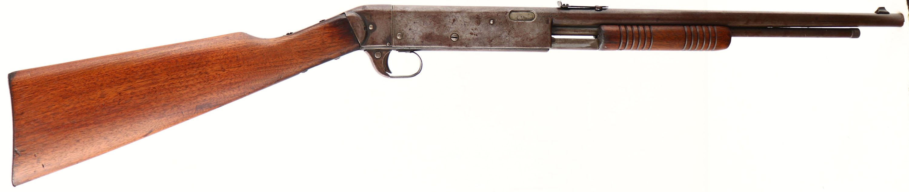 C.J Hamilton & Sons Model 39, .22 SHORT, MFG: 1922-30, SN: NONE, Pump Action Rifle, 16'' barrel. 35'' overall length. This is the only repeating rifle manufactured by Hamilton. The tubular magazine holding 15 cartridges. The wood stocks are good & solid, having been lightly sanded & refinished. There is a small chip at the retention screw of the forearm. There are also other small contusions & scratches. Metal blue finish has worn to a gun metal gray, with a thin brown patina. Steel rolled barrel, with original brass liner. The 12 groove bore with 1 turn in 16'', r.h. twist, is good, but with smoothing rifling. Barrel fitted with open adjustable rear & standard front sight. Original thin metal buttplate. A surviving example of this rare pump Hamilton. FFL or C&R Req. - Value: 120 to 250