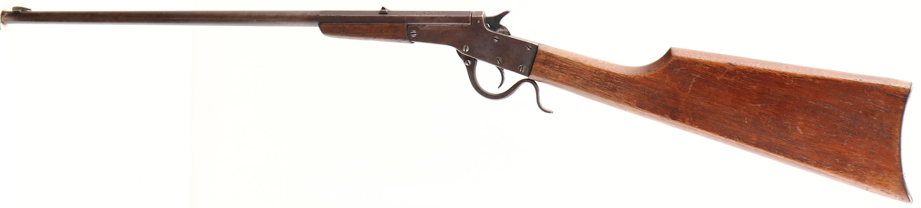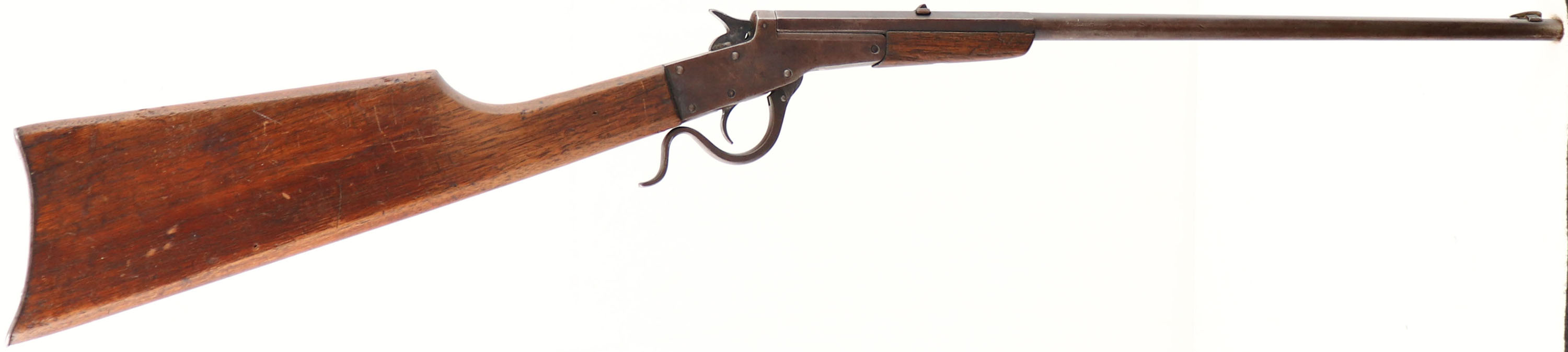 J. Stevens A&T Co., Model: Stevens Maynard Jr, Cal: .22 Short, MFG: 1900-12, S/N: None, lever action single shot, 18 1/3'' Octagon to round barrel. The straight wrist wood stock & forend are very good, with various minor dings, dents, & scratches from use/age. There is a 2'' carck on each side of the comb at the buttend & a couple of tiny hairline cracks at the wrist. The metal has toned to a thinning brown patina, with some scratches & dings. The top of the barrel is marked ''J. STEVENS A&T. CO.'', ''CHICOPEE FALLS,MASS.U.S.A.'', ''STEVENS-MAYNARD JR.'', ''22-SHORT''. The bore is good & clean, with roughness & thinned rifling. The barrel holds a blade front sight & a U-notch rear sight. The stock carries a smooth steel buttplate, with brown patina. FFL or C&R Req. - Value: 150 to 300