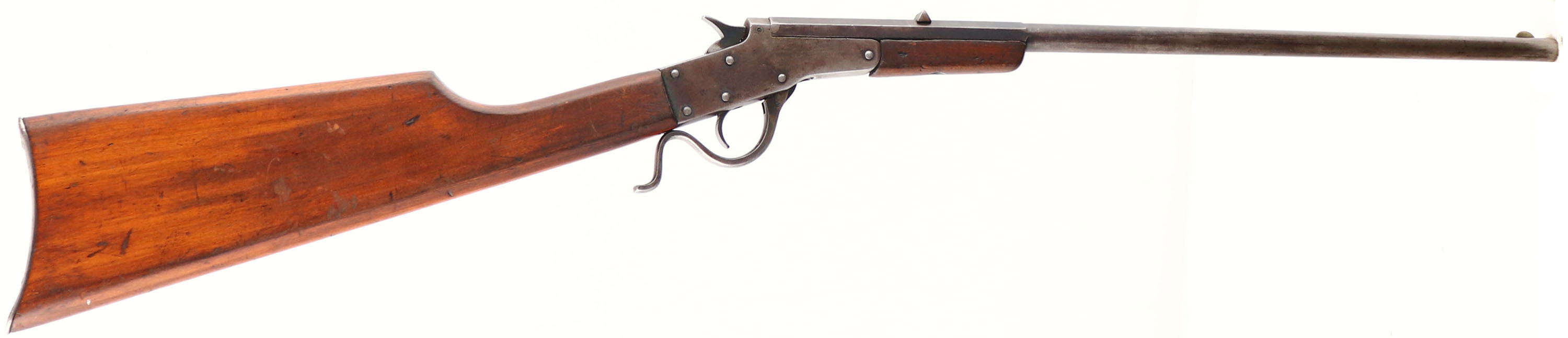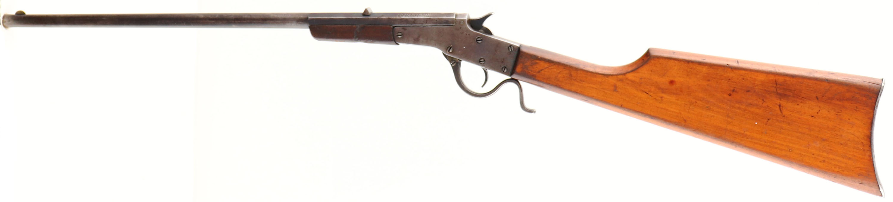J. Stevens A&T Co., Model: Stevens Maynard Jr, Cal: .22 LR, MFG: 1900-12, S/N: None, lever action single shot, 18'' 1/3 octagon to round barrel. The straight wrist wood stock & forend are very good, with various dings, scrapes, & scratches from use/age. The barrel retains about 20% bluing, with most areas worn to a gun metal gray & toning to a brown patina. The receiver has worn to gun metal gray, with a brown patina. The top of the barrel is marked ''J. STEVENS A&T. CO.'', ''CHICOPEE FALLS,MASS.U.S.A.'', ''STEVENS-MAYNARD JR.'', ''22-LONG RIFLE''. The bore is good, with roughness & light pitting. The barrel holds a blade front sight & a V-notch fixed rear sight. The stock carries a smooth steel buttplate. FFL or C&R Req. - Value: 150 to 300