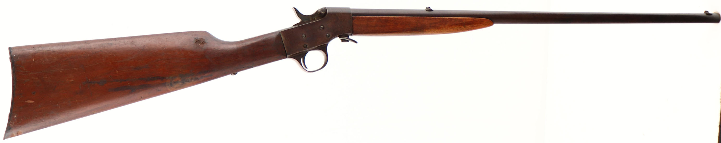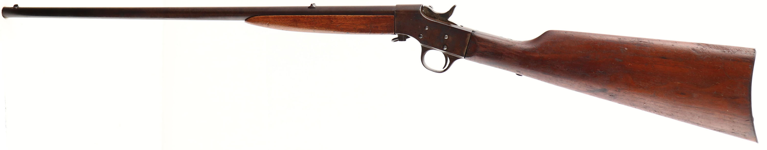 Meriden, Model 10, CAL: Marked .22 Short & Long, but will fit a LR, MFG: 1910-17, SN: NONE, Single Shot Rolling Block Rifle, 22'' barrel. The straight grip wood stocks are verry good & solid. The buttstock has three small stress cracks at the wrist & a small fill repair on the right side near the comb. There are numerous minor contusions, scratches & scrapes. The metal blue finish on the barrel has toned to a brown patina. The case-hardened frame has also toned to a brown patina. Bore is poor, dark & rough. Fixed notch rear sight & blade front sight. Smooth metal buttplate. FFL or C&R Req. - Value: 100 to 250