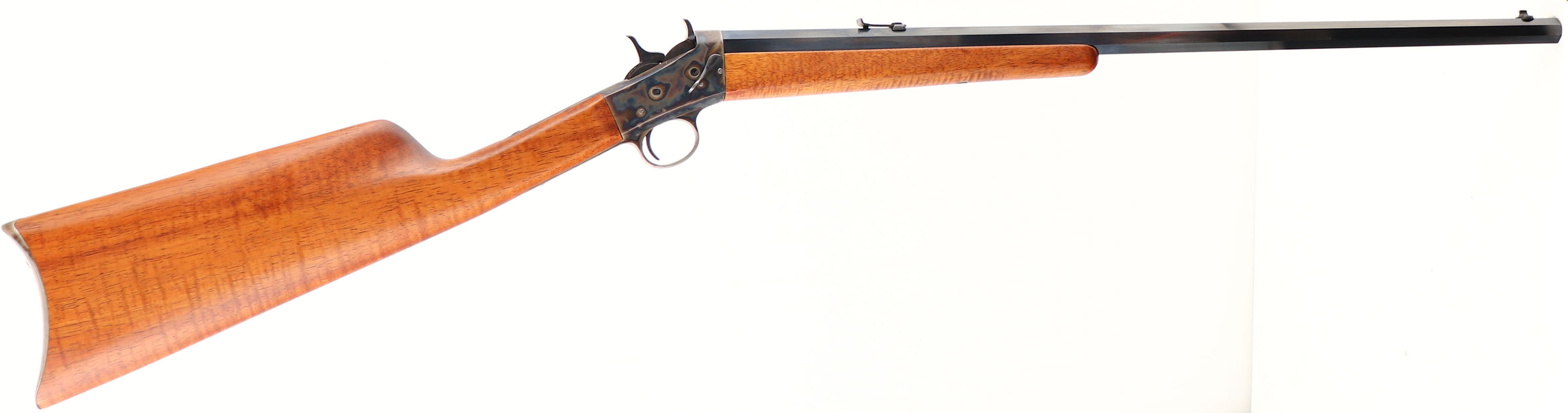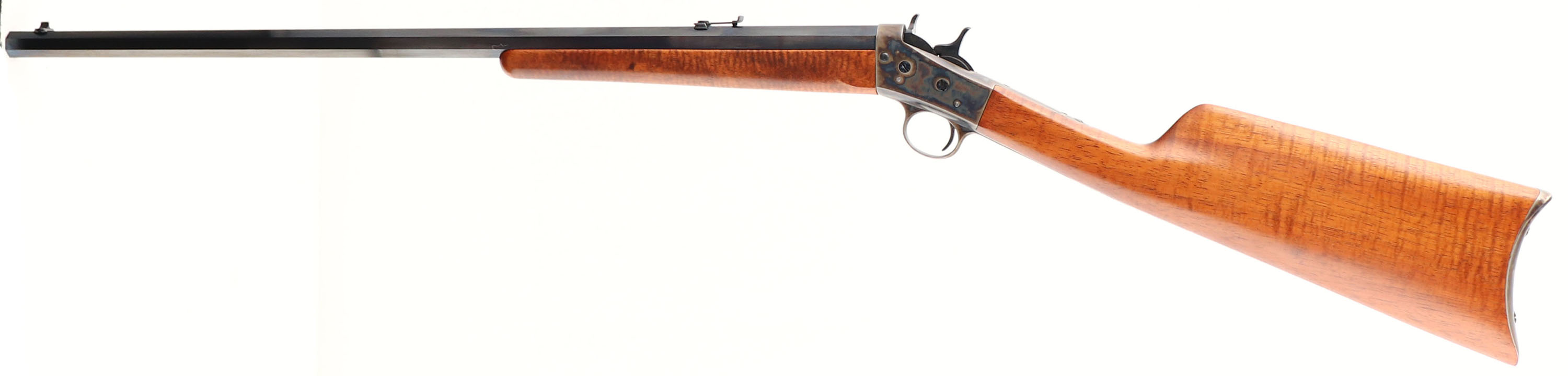 Remington, Model 4 Rolling Block, CAL: 22, MFG: 1901-26, SN: 156200, Single Shot Rolling Block Rifle, 24'' octagon barrel. This gun has been fully & professionally restored. The straight grip wood stocks are excellent. The metal blue finish on the barrel rates 99%, with visible brush lines. The case-hardened frame displays excellent case-colors. Bore is excellent. Adjustable rear sight & blade front sight. Case-hardened crescent buttplate. Missing screw on upper tang. FFL or C&R Req. - Value: 300 to 600