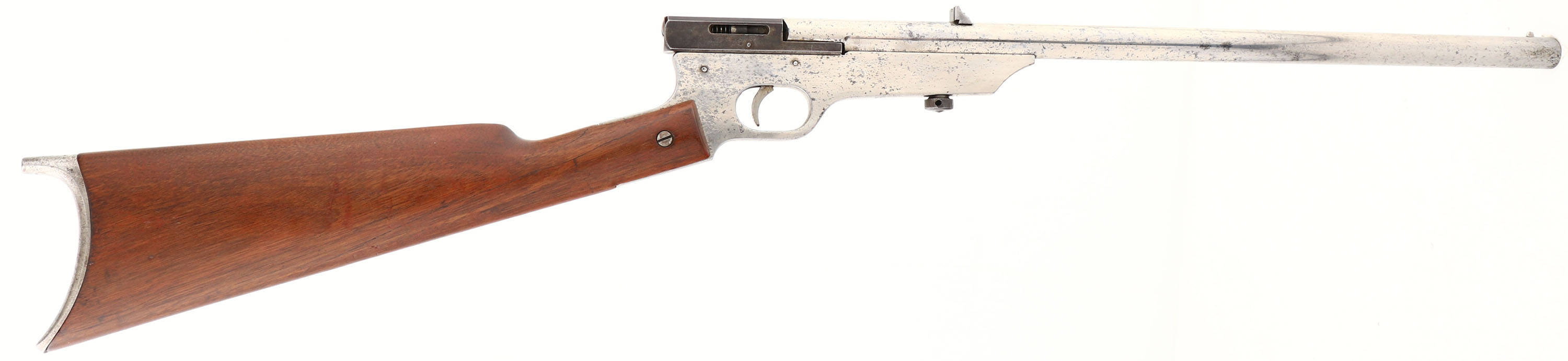 H.M Quackenbush Model ''Safety Cartridge'', .22 Cal., MFG:1896-1908, SN: NONE, Swing Gate Single Shot Rifle, 18'' round barrel. The Safety Cartridge rifle started production in 1896 to 1920, but a wood forearm was added in 1908. This is the earlier version without the forearm. The original straight grip wood stock is good & solid, having been repaired after a wrist break, sanded & refinished. It has three wood dowels used in the repair, of which the ends can be seen in the belly of the stock. The are very few tiny handling marks remaining after refinish & the stock presents very well. The nickel finish was redone after the metal was buffed polished & prepared. It's retained at over 90%, but coverage is over previous rust pitting or blemishes, & the nickel is starting to spot & dull due to corrosion developing under nickel. Stamping on left side of the receiver remain clear. Bore is clean & good, but with scarring amongst thinning rifling. Barrel is fitted with rear fixed sight & a small post blade front sight. Original early swiss style metal buttplate with nickel finish. Broke off cocking handle. Early example. Due to broken bolt handle & possibly other unseen issues, this rifle is being sold ''AS-IS'', with no returns. FFL or C&R Req. - Value: 80 to 150