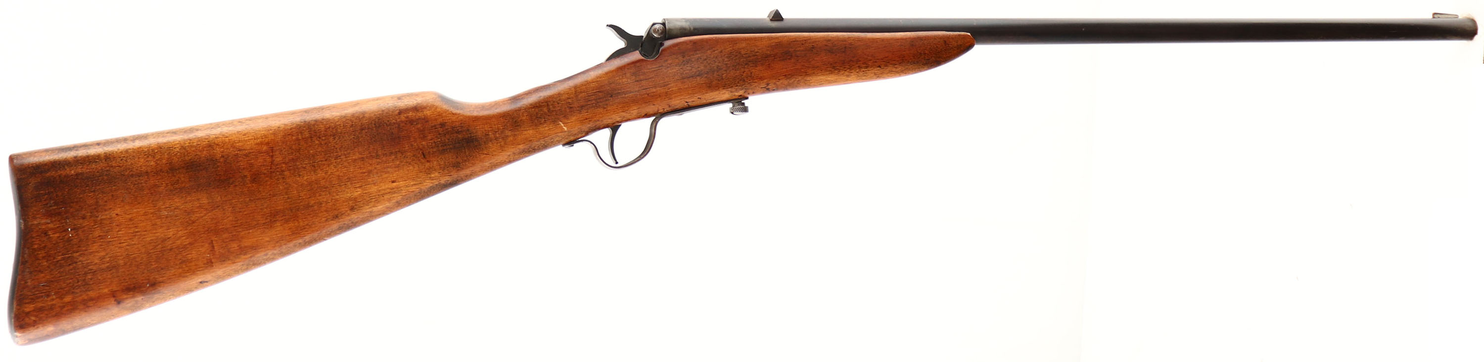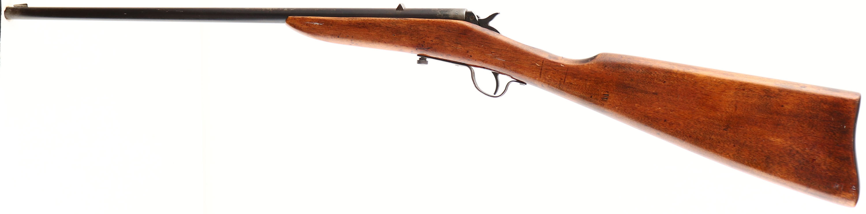 J. Stevens, Stevens Junior - Model 11, CAL: 22 S,L,LR, MFG: 1924-31, SN: NONE, Single Action Falling Block Rifle, 20'' barrel. The straight grip wood stock is very good, having been sanded & refinished. There is a small chip coming off the top tang, along with couple of thin hairline cracks. There remains smoothed contusions & scratches. The metal blue finish on the barrel has toned to a mix of metal blue/gray finish & brown patina, with spots worn to metal gray. Bore is very good, with light scarring. Fixed rear sight & brass blade front sight. Produced without a buttplate. FFL or C&R Req. - Value: 50 to 150