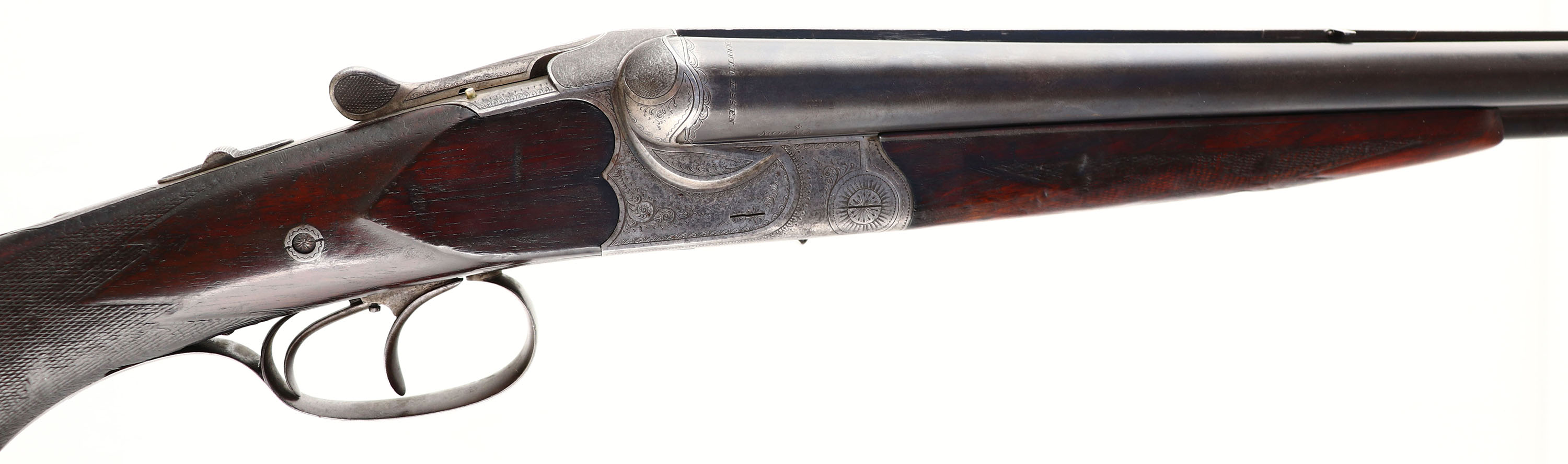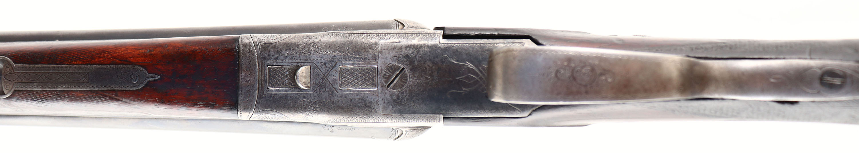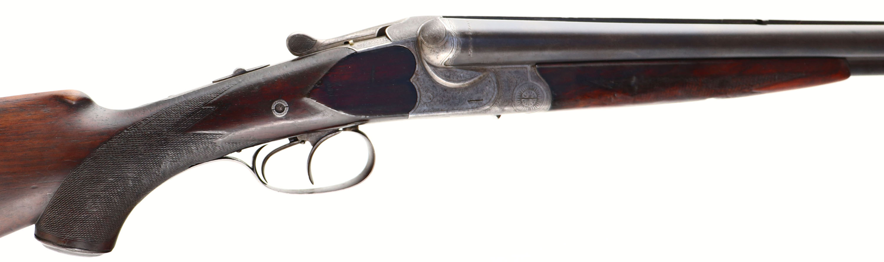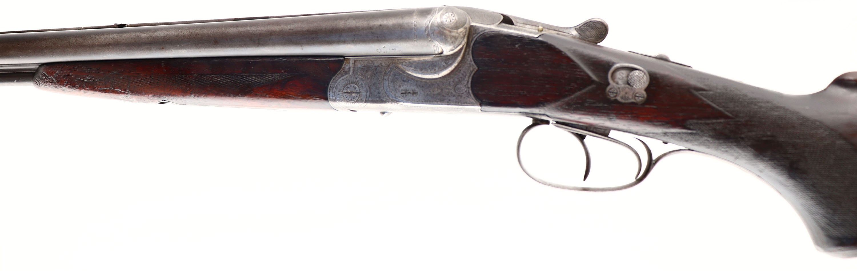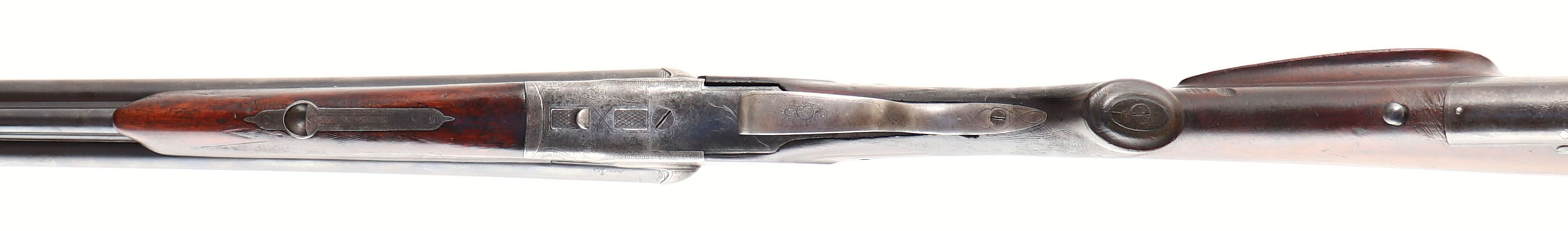 German Guild, Drilling, CAL: 16x16 & 8x57JRS (.313 Bullet), MFG: 1950's, SN: 21853, Break Action Combo Gun, 26 3/4'' barrels. The barrels are marked ''FLUS STAHL'' & ''KRUPP ESSEN'', with nitro proofs on both barrels. There are no other manufacturer markings. The checkered, capped pistol grip stock & forend are very good & solid. There is a small crack coming off the back of the upper tang, smoothed contusions, scratches, scrapes & smoothed checkering. There have been protective oils added over time & an added layer of finish. The belly of the stock has an integral 4 round chamber with push button flip-up door. The metal blue finish on the barrels rates 70% coverage, toned to a brown patina, with areas worn to metal gray & toned to a thin brown patina. The case-hardened receiver has externally worn to metal gray & toned to a brown patina, with case-colors remaining on the inside of the receiver. The receiver, trigger guard, break lever, safety switch & forend break lever all display intricate ornamental scroll engraving. Shotgun bores are very good, with light scarring, roughness near the chamber & visible striations. The rifled bore is excellent. The rifle is fitted with a tang switch activated flip up rear sight. & beaded blade front sight. Stock has a checkered plastic buttplate. FFL or C&R Req. - Value: 1000 to 3000
