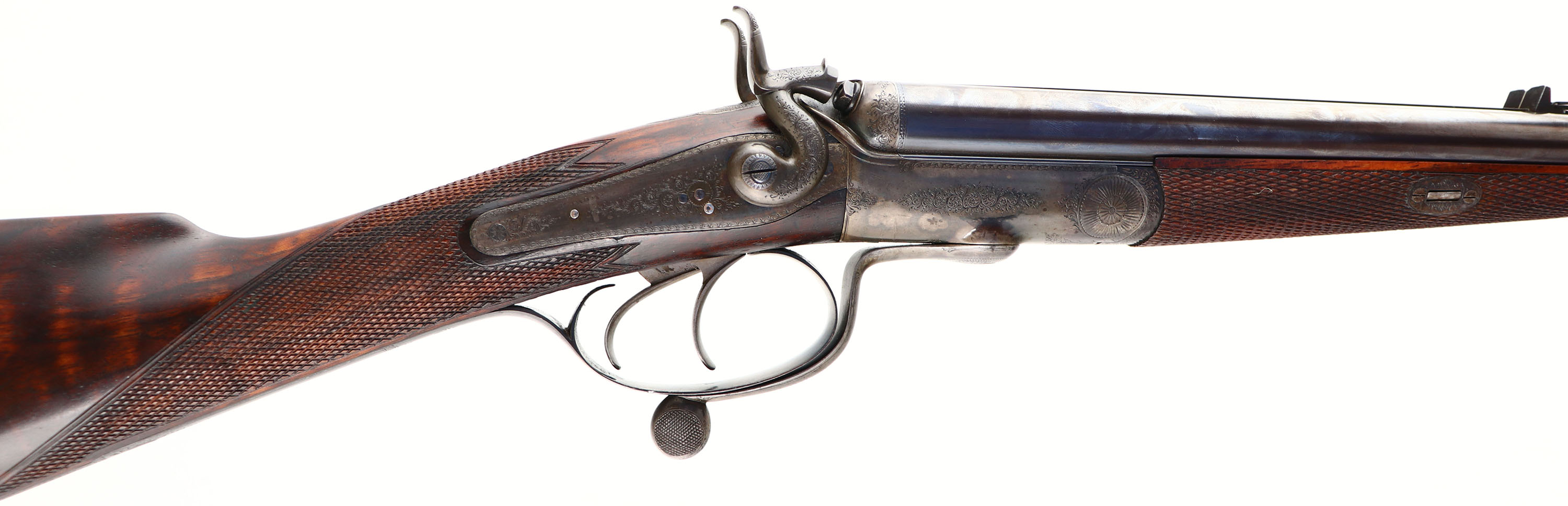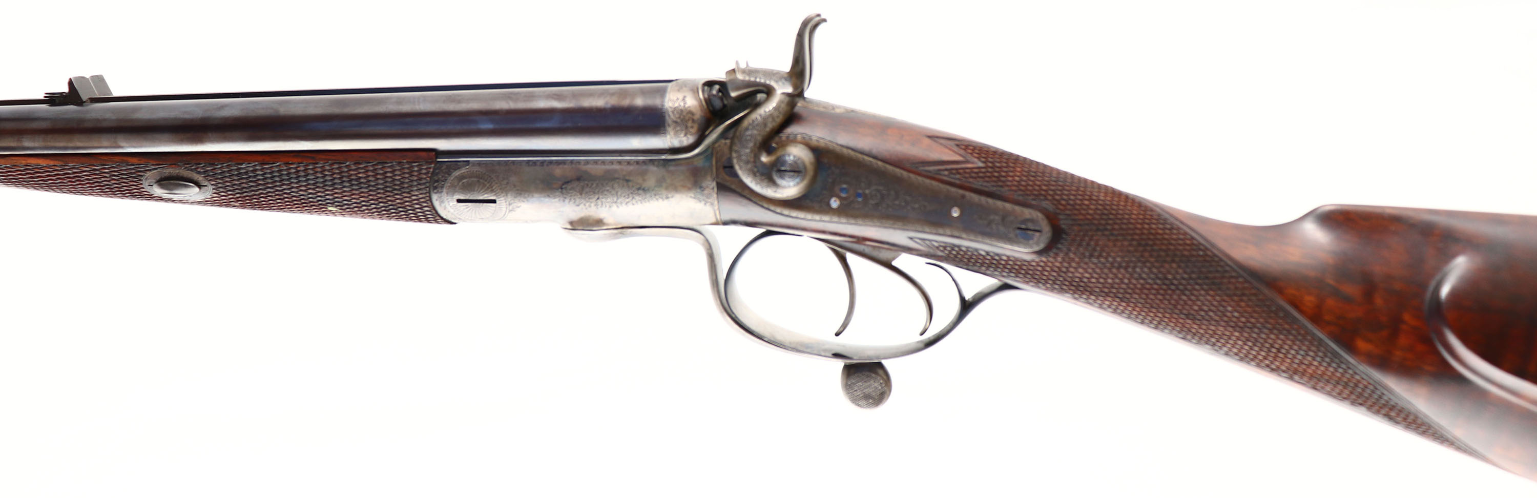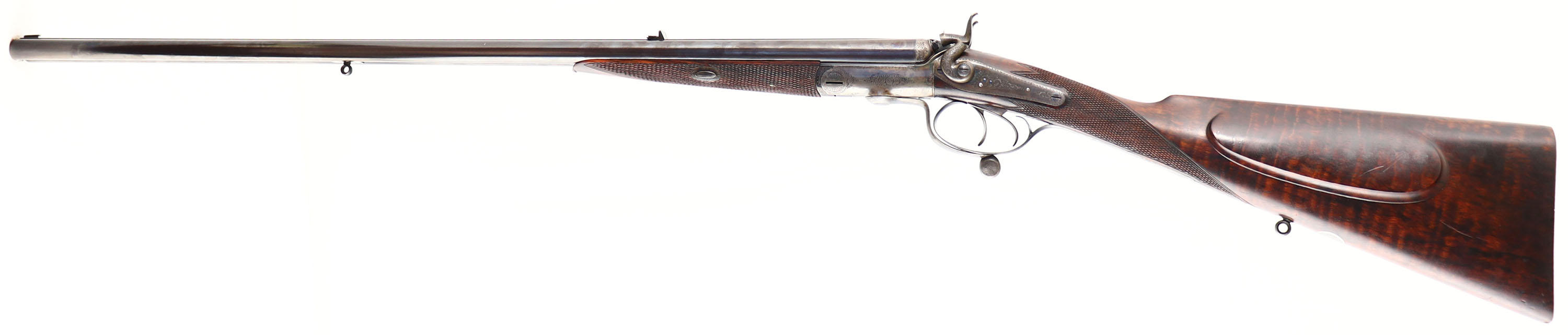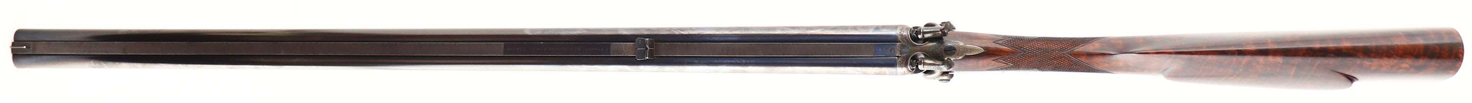RARE & FABULOUS, J. Purdey, Jones Patent Underlever Hammer Express Rook Rifle, CAL: .360 #5 Rook, MFG: 1876-77, SN: 9675, Break Action SxS Rifle, 26 7/8'' barrels. The rib is marked ''J.PURDEY, 314 1/2, OXFORD STREET, LONDON''. The side plates are marked ''PURDEY''. The full SN can be found on the lower tang & barrel. The original checkered straight grip wood stock, with beaded cheek & inlaid forend tip are excellent. There are only contusions & a couple handling marks to the finish. There is an inscribed oval initial plate in the belly with the initials ''DC'' in cursive. The original metal blue finish on the barrels rates 99% & has toned to a nice, even plum patina. The trigger guard has retained the blued tone, with minor spotting on the left side above the SN. The case-hardened receiver retains excellent case-colors, with a thin brown patina coverage. Bores are both excellent & bright. 3-tier folding leaf rear sight & beaded blade front sight. The stock & barrel rib hold sling studs. Checkered butt. This rifle is accompanied by a copy of a Purdey Letter, confirming the date & other pertinent information. Antique, No FFL Req. - Value: 15000 to 20000