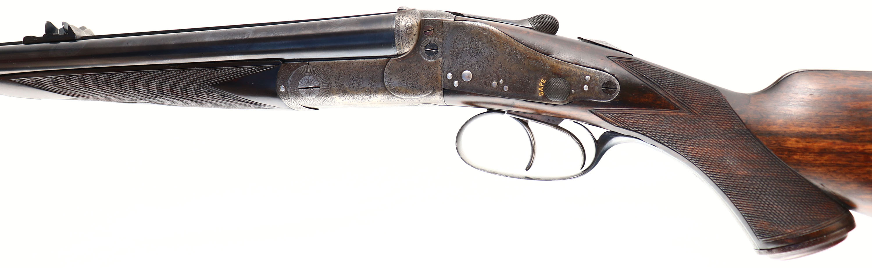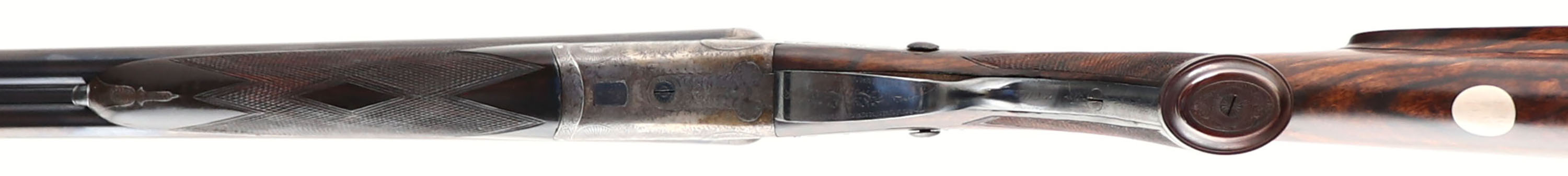 Holland & Holland, Double Rifle, CAL: 450/400 2 3/8'', MFG: circa 1880's. SN: 11257 (22000 SN Dates 1899), Break Action SxS Rifle, 26'' barrel. This rifle has been fully & professionally restored. The silver oval plaque on the left side of the stock reads ''TO RAOBAHADUR DADASHEB SURVE PRIME MINISTER KOLHAPUR BY S.R. DESAI OF CHINCHALI''. The side plates are marked ''HOLLAND & HOLLAND''. The right barrel is marked ''HOLLAND & HOLLAND 98 NEW BOND STREET, LONDON'' & the left barrel is marked ''WINNERS OF ALL ''FIELD'' RIFLE TRIALS LONDON 1883'' The checkered, capped pistol grip stocks are excellent. There are two small repaired cracks on either side of the upper tang, small edge chips, a dowel fill where the sling stud was & minor handling marks. There is a blank oval initial plate on the belly of the stock. The metal blue finish on the barrel rates 99%. The front sling provision has been removed. The case-hardened receiver has fully worn to metal gray, with applied brown patina. There are remnants of case-colors on the inside of the receiver on the firing pin face & floor plate. The word ''SAFE'' on all three safety levers is gold inlaid. The receiver, side plates, trigger guard, break lever, cap & forend meal components all display beautiful & intricate ornamental scroll engraving. Bores are very good, appearing slightly grainy. The solid, matted rib holds a 3-tier folding leaf rear sight, with graduations from 50-250 & a beaded blade front sight. Tang safety & separate barrel safeties on both sides of the receiver. Grooved plastic buttplate. This rifle comes with a set of custom made 450-400 2 3/8'' dies. Although this rifle has been restored, it still presents excellently. Antique, No FFL Req. - Value: 10000 to 12000