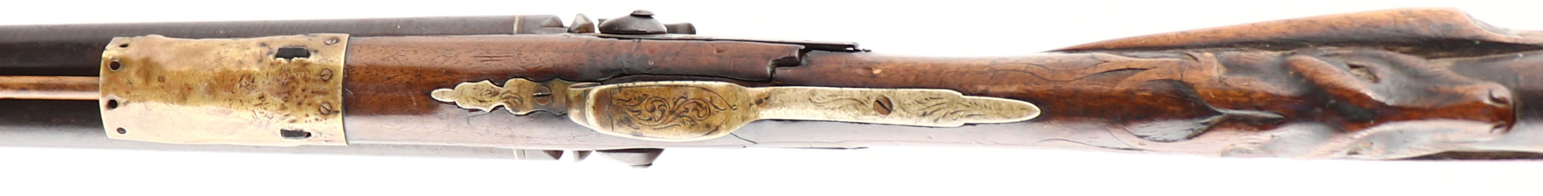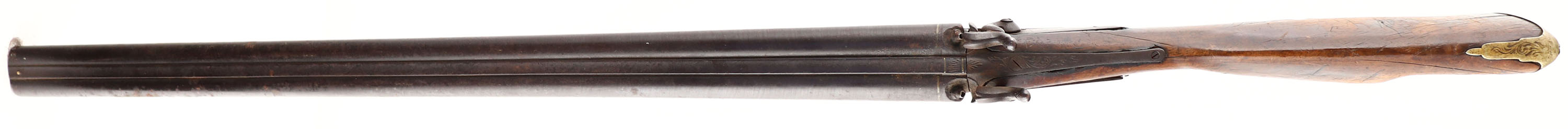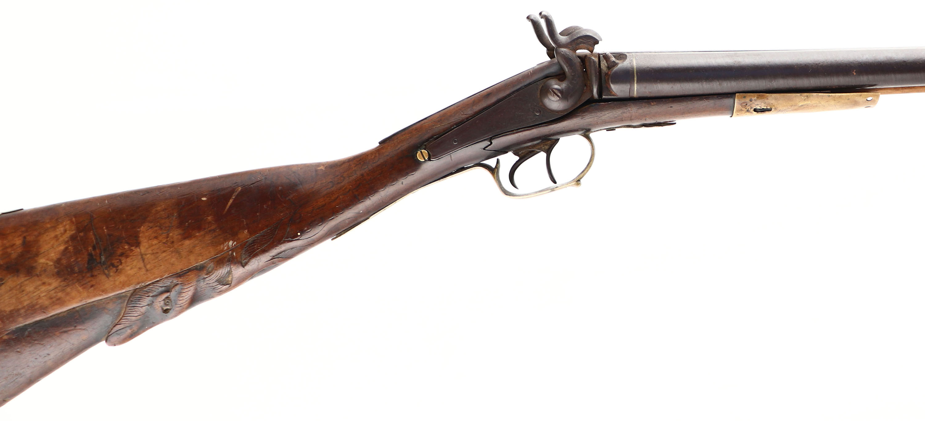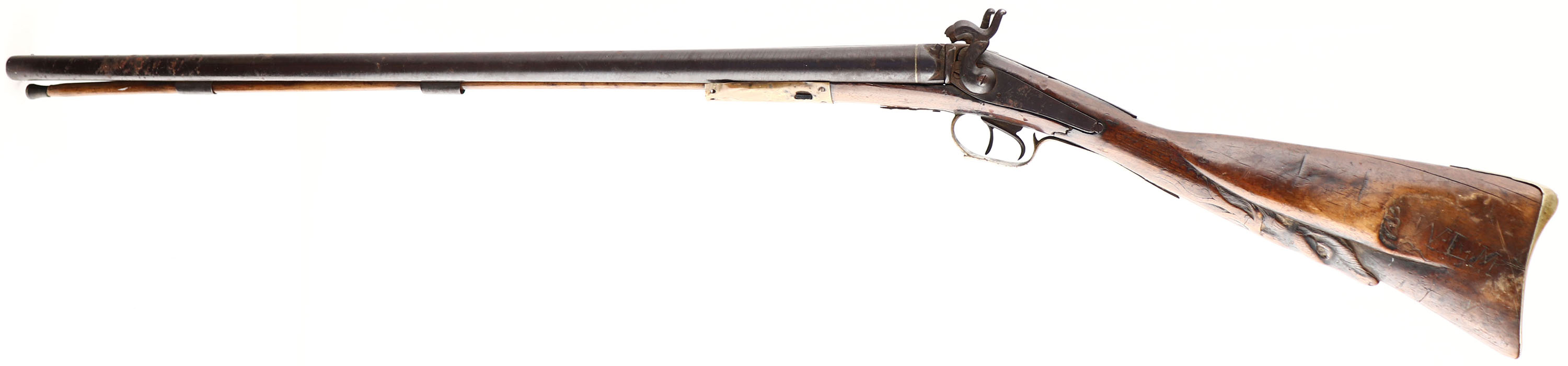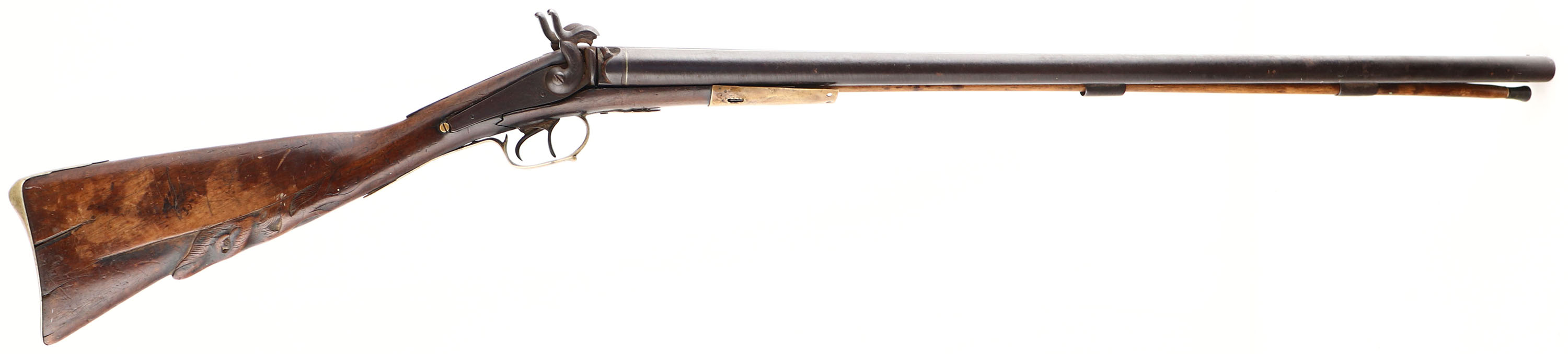 Unknown Mfg. SxS Muzzleloader Shotgun, CAL: BALL, MFG: N/A, SN: NONE, 28'' barrels. The carved wood stock is poor, with a full break at the wrist, multiple cracks coming off the buttplate, alongside contusions, scrapes & letters scratched into both sides. Overall, the metal finish has worn to metal gray & fully toned to a brown patina. The brass metal components have an aged patina. Bores are poor, dark & rough. Solid rib holds a worn front bead. Brass buttplate. Blackpowder, No FFL Req. - Value: 50 to 100