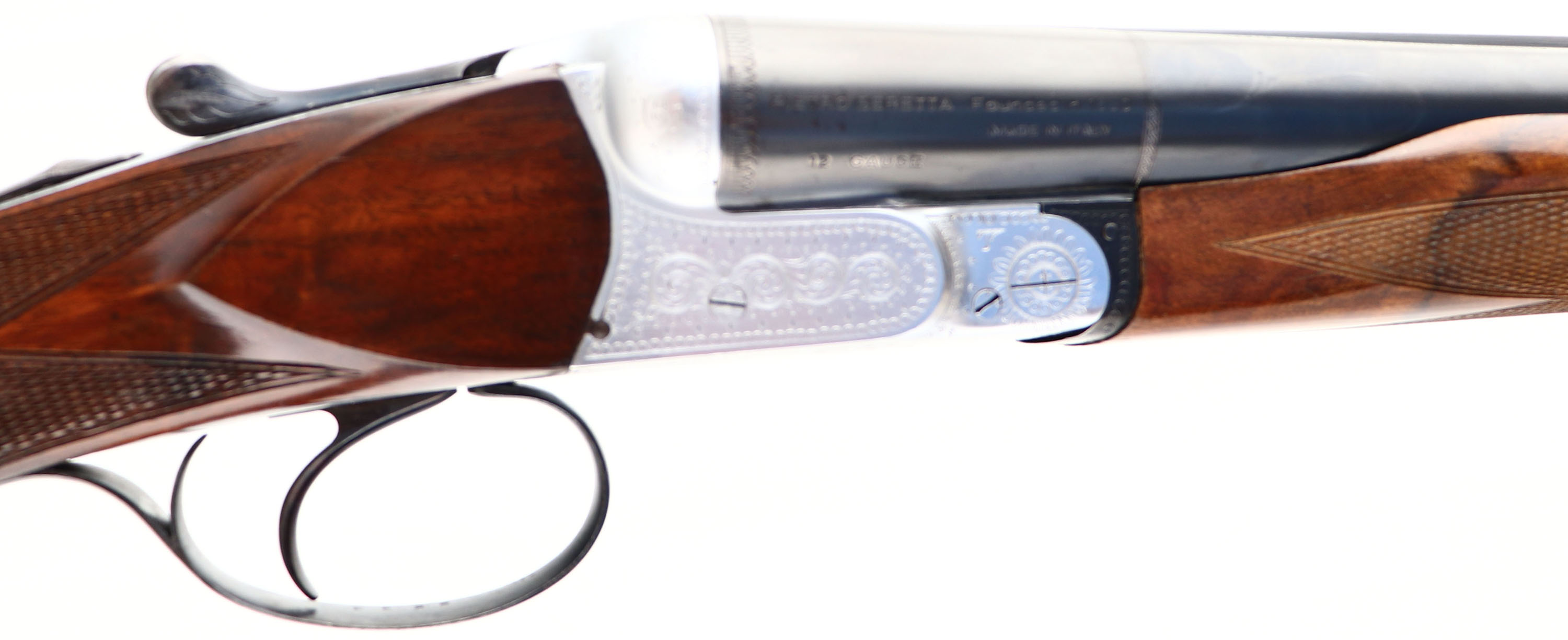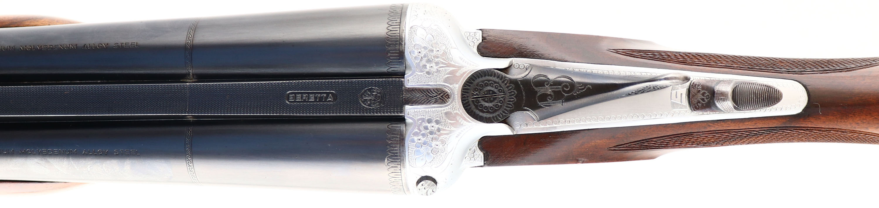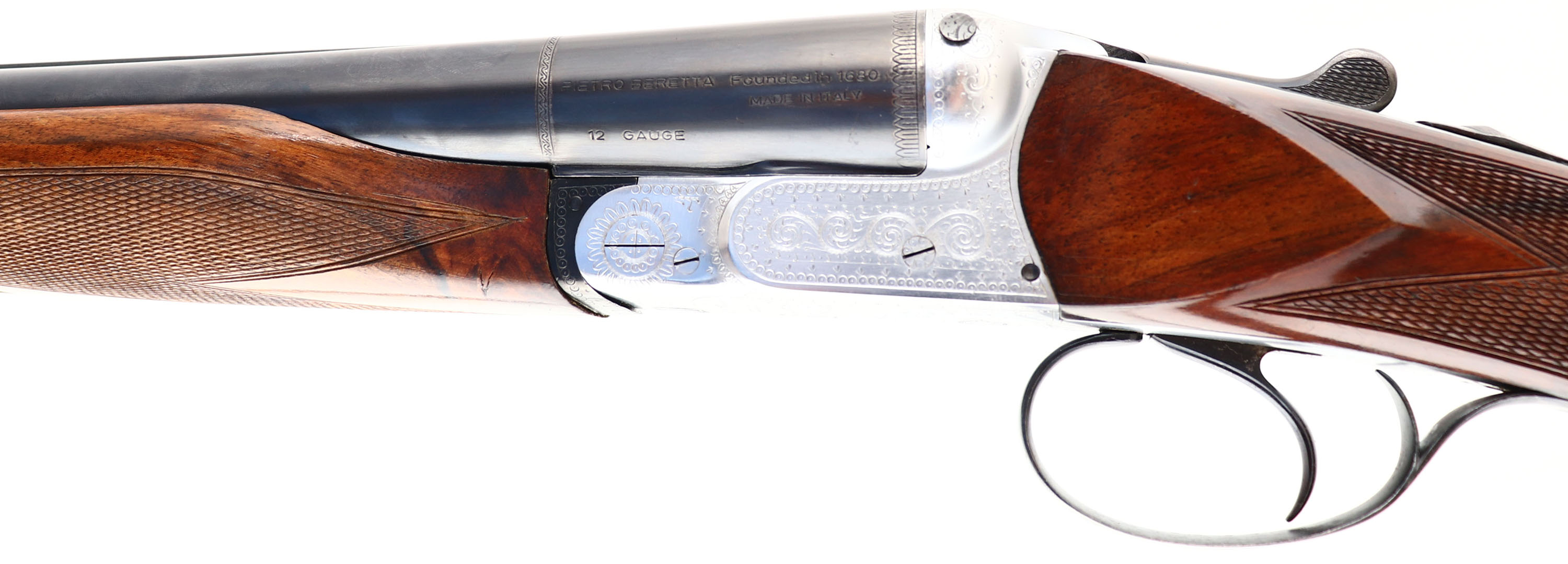 P. Beretta, Silver Hawk, CAL; 12GA, MFG: 1961, SN: C48556, Break Action SxS Shotgun, Choke: F/IC, 28'' barrels. The checkered & capped pistol grip stocks are excellent. There are scrapes & dings to the high gloss finish. The metal blue finish on the barrels rates 98% & the coin silver receiver is bright. The receiver, trigger guard, break lever, barrels & safety switch all display intricate ornamental scroll engraving. Bores are excellent. The solid matted rib holds a single front bead. Stock carries a Beretta checkered plastic buttplate. An excellent representation of an orignal Silver Hawk from the 60's. FFL or C&R Req. - Value: 1300 to 2000