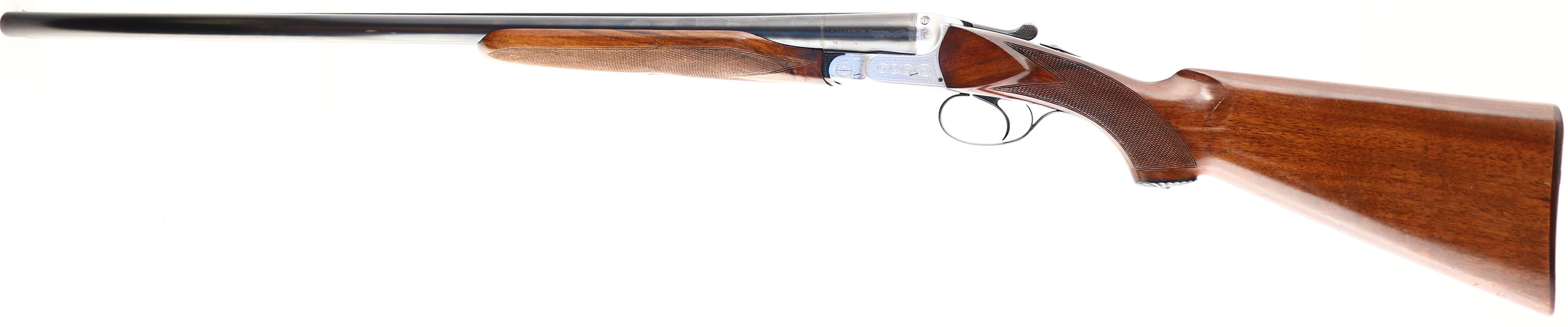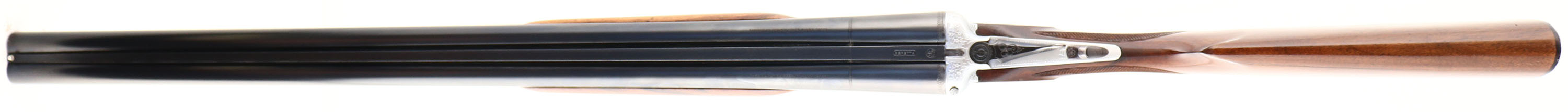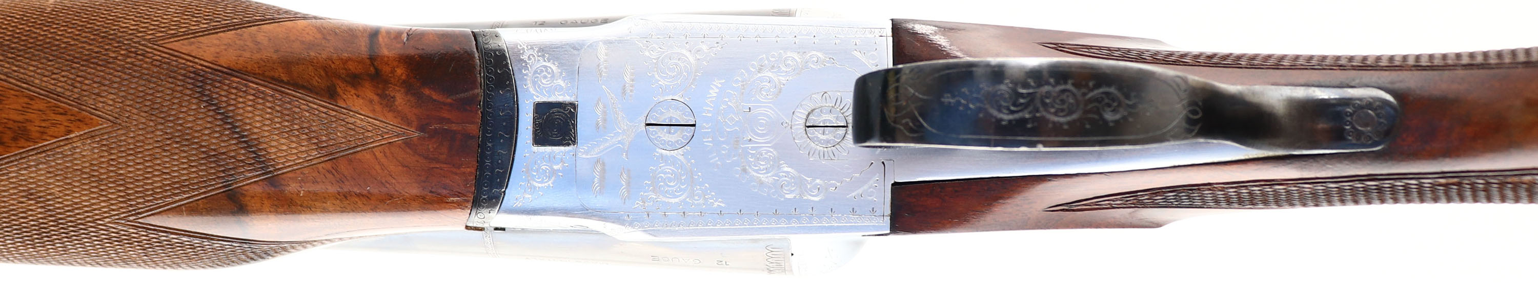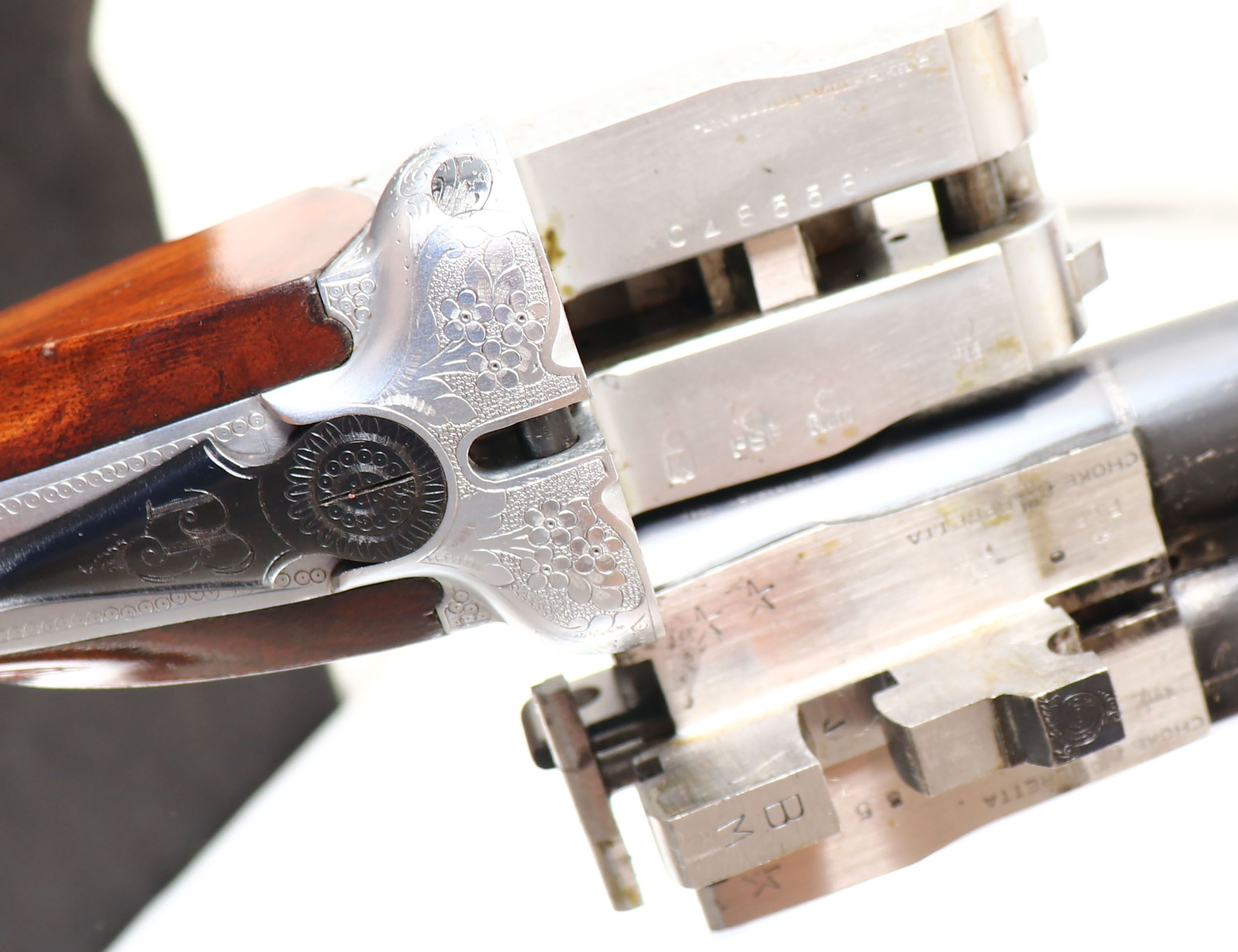 P. Beretta, Silver Hawk, CAL; 12GA, MFG: 1961, SN: C48556, Break Action SxS Shotgun, Choke: F/IC, 28'' barrels. The checkered & capped pistol grip stocks are excellent. There are scrapes & dings to the high gloss finish. The metal blue finish on the barrels rates 98% & the coin silver receiver is bright. The receiver, trigger guard, break lever, barrels & safety switch all display intricate ornamental scroll engraving. Bores are excellent. The solid matted rib holds a single front bead. Stock carries a Beretta checkered plastic buttplate. An excellent representation of an orignal Silver Hawk from the 60's. FFL or C&R Req. - Value: 1300 to 2000