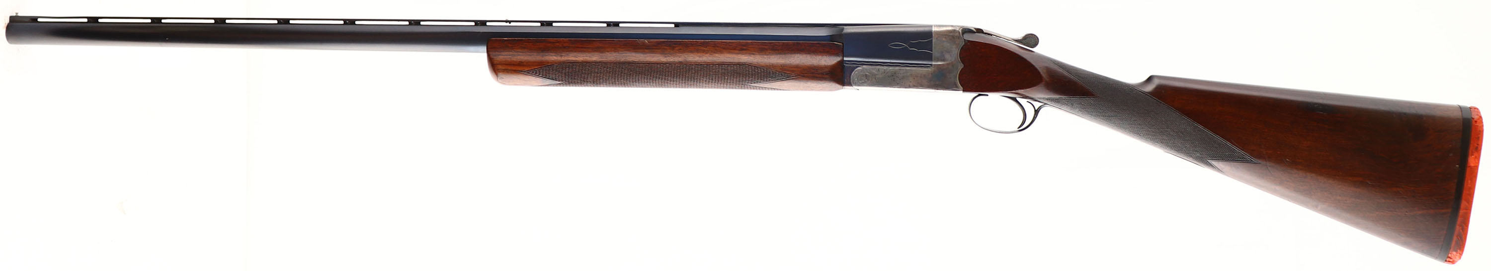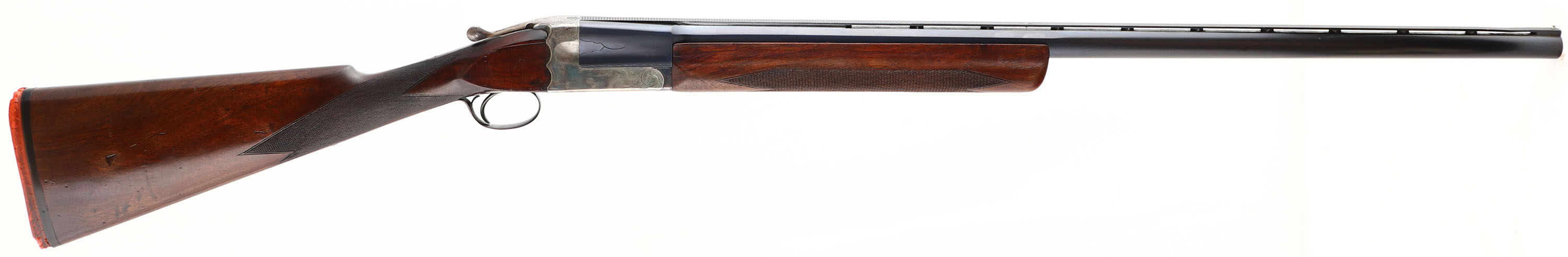Baker Gun Co., One-Barrel Trap Gun (Early Sterling), CAL: 12GA, MFG: 191-22, SN: 40115, Break Action Single Shot Shotgun, 32 1/4'' barrel. The checkered straight grip wood stocks are excellent. There are minor scrapes, dings & the buttstock has some spot fills, with an added layer of varnish. The professionally restored metal blue finish on the barrel rates 97%. The original case-hardened receiver retains visible, but fading case-colors. The receiver, trigger guard & barrel display simple ornamental engraving. Bore is excellent. The matted ventilated rib holds a small mid-rib ivory bead & steel front bead. Stock has a worn & cracked solid orange rubber recoil pad. FFL or C&R Req. - Value: 1400 to 2200