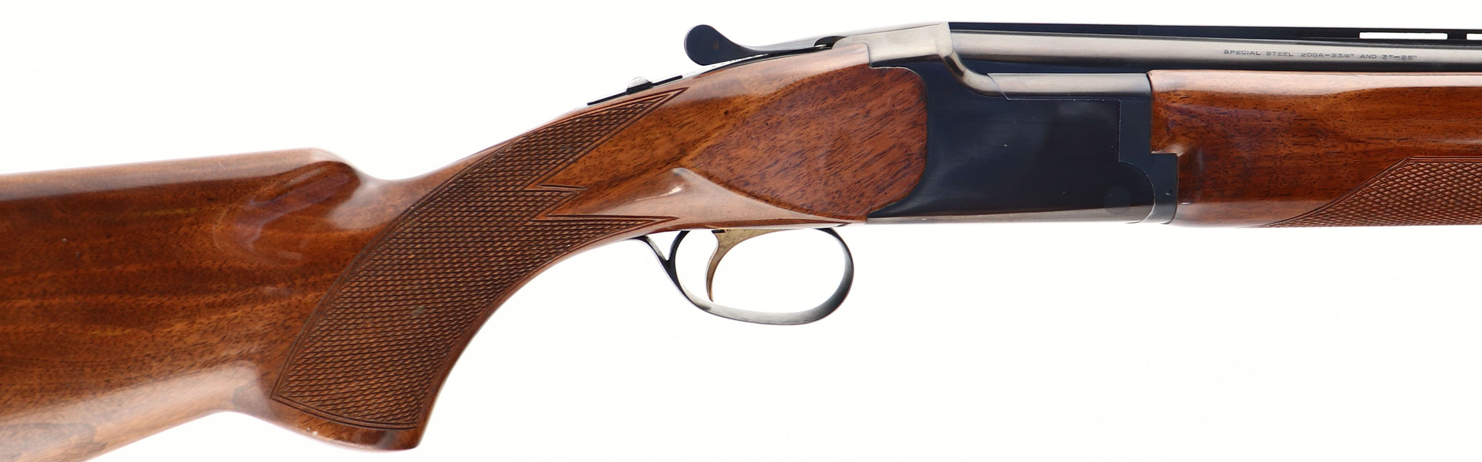 Browning, Citori, CAL: 20GA, MFG: 1974, SN: 05439N47, Break Action O/U Shotgun, 26'' barrels. The original checkered flat pistol grip stock is excellent, with minor handling marks. The meal blue finish rates 98% overall. The receiver is beginning to tone plum. Bores are excellent. The ventilated rib holds a single front bead. Pachmayr ventilated brown rubber recoil pad. Gold tone trigger. FFL Req. - Value: 1000 to 1600