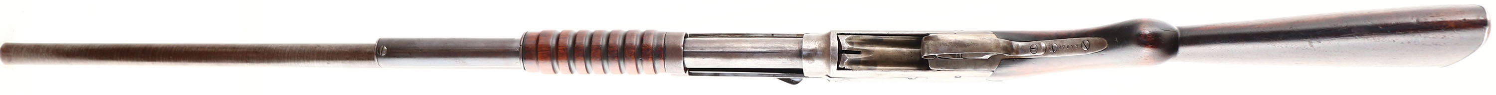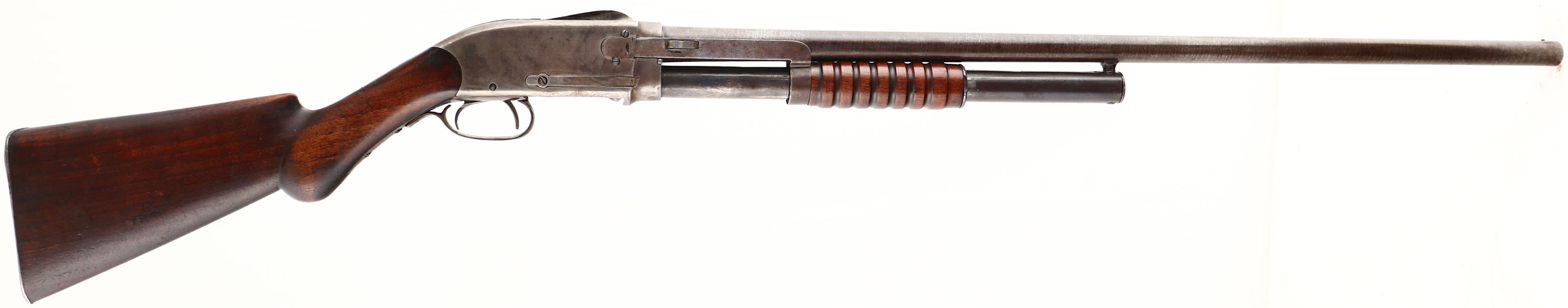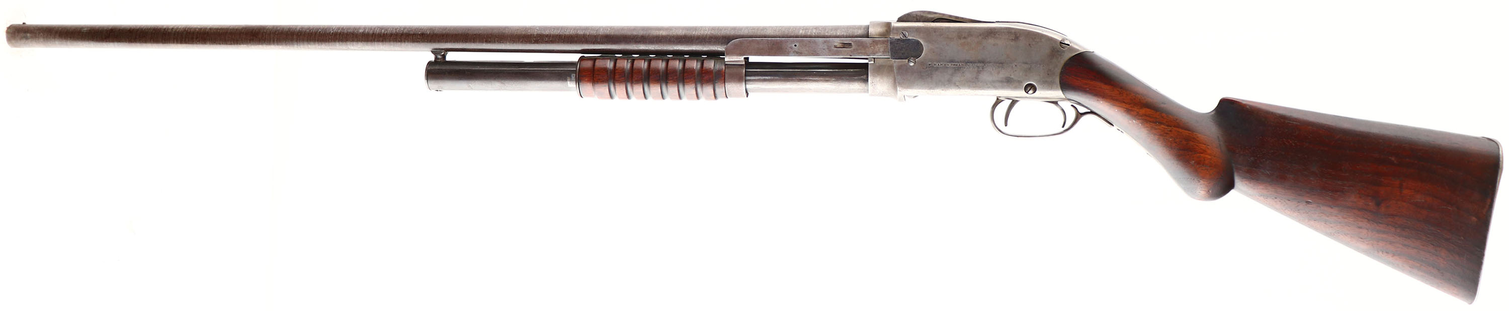 F.Bannerman, Model 1896 Spencer Repeating Shotgun, CAL; 12GA, MFG: 1897-98, SN: 17173, Pump Action Shotgun, 30'' barrel. The Spencer-Roper Pump Action Shotgun was the first commercially successful pump shotgun, while not the first design to use a slide action, it was the first to be mass produced & successfully sold. Co-designed by Christopher Spencer, perhaps best known for his repeating rifle, & Sylvester Roper. The pump action was not Ropers first shotgun design, in 1866, he patented a revolving shotgun & in 1889 he developed another pump action design. In April 1882, Spencer & Roper were granted a patent on their design & subsequently established the Spencer Arms Company in Amherst, Massachusetts. They introduced the Spencer Model 1882, based on their pump action designs. Chambered in 10 & 12 ga, with the latter being the most popular, the 1882 has a tubular magazine below the barrel which holds five black powder shells. The Spencer-Roper has a complex action, by cycling the pump the guns pivoted breech block drops below the receiver allowing the next shell to enter the action while almost simultaneously the spent shell is ejected out the top of the gun. What appears to be another trigger facing backwards inside the trigger guard is actually the hammer spur. Ergonomically the early shotguns had very small pump handles & deeply swept stocks this changed in this later model 1896, with larger pump handles being introduced. By 1885, Spencer was in serious debt & sold the patent rights to Francis Bannerman. Bannerman starting putting his name on the side & called them the model 1896. According to resources, he made this model from late 1895- 1898 going to appx SN 18,000. The original round knob wood stock & grooved forend are very good & solid. There are a couple popped grains at the heel, along with contusions, scrapes & dings, with added protective oils contributing to darkening of the finish. The browned finish on the laminated steel barrel is very good, with a clear laminated pattern. The case-hardened receiver has shadows & remnants of faded case-colors. Bore is very good & bright, with visible striations from use. Barrel has a worn front bead. Checkered widow's peak metal buttplate. Antique, No FFL Req. - Value: 500 to 1000