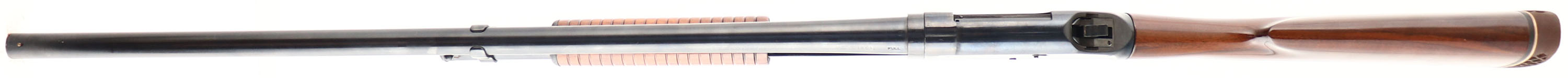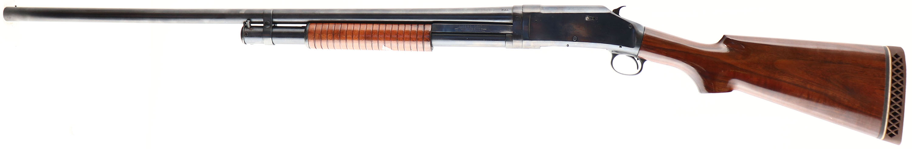 Winchester, Model 1897 Take-Down, CAL: 12 GA, MFG: 1914, SN: 618740, Pump Action Shotgun, Choke: Full, 30'' barrel. The replaced flat knob pistol grip stock & original corncob forend are very good. The metal finish has an excellent reblue which rates 97%. Bore is very good. Barrel holds a single front bead. Stock carries an Pachmayr ventilated recoil pad. FFL or C&R Req. - Value: 300 to 600