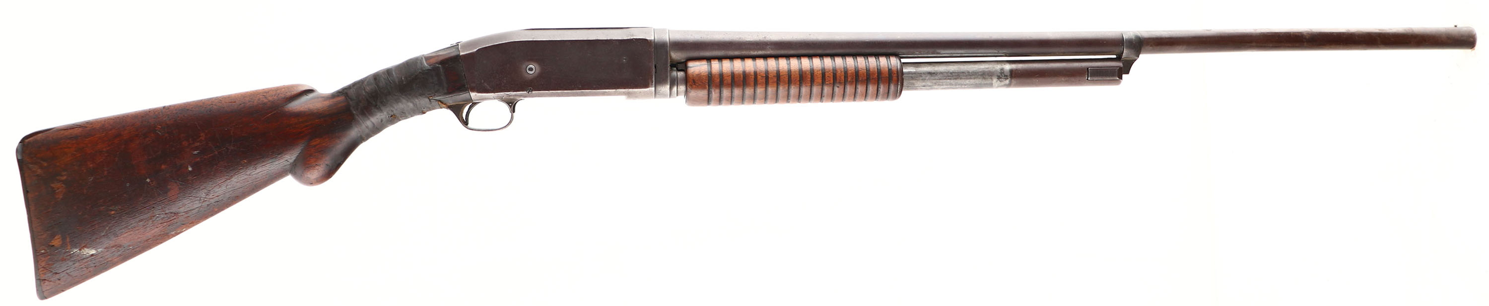 Remington, Pre Model 10, CAL: 12 GA, MFG: 1919, SN: 96798 Pump Action Shotgun, Choke: Full, 30'' No rib barrel. The round knob pistol grip wood stock is held together by old tape at wrist, both the stock & forearm show nicks & dings. The metal blue has toned to a brown patina. Bore is poor. The barrel holds a front bead. Stock carries an original REM UMC buttplate that is cracked. Sold ''AS IS'', with no returns. FFL or C&R Req. - Value: 100 to 300