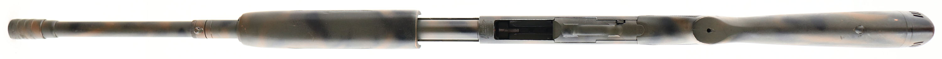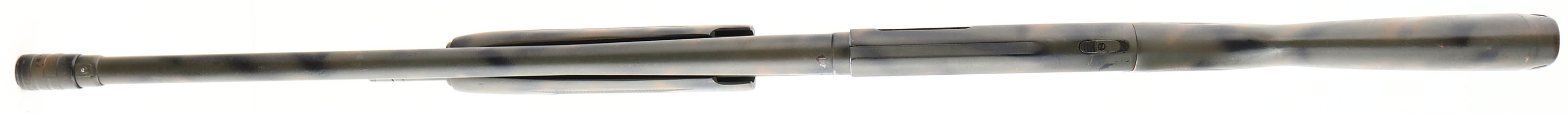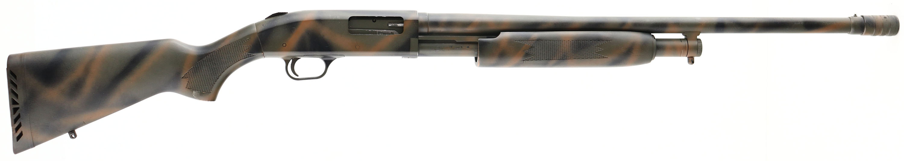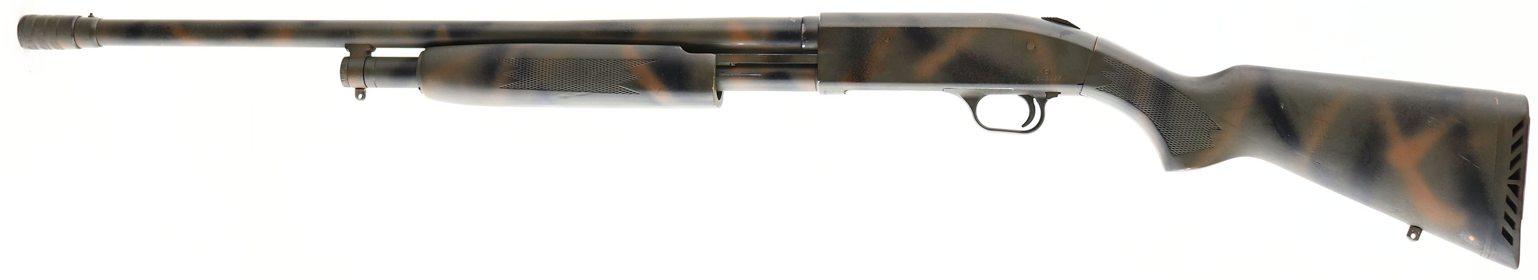 Mossberg, Model 500A, CAL: 12 GA, MFG: Modern, SN: l246495, Pump Action Shotgun, 2 3/4 & 3'', has an added multi choke system to tip of barrel, 26'' barrel. The original wood checkered stock has been painted camo, flat pistol grip stocks are very good, with handling marks to the camo paint. The metal has also been camo panting & shows some wear, Bore is very good. Has front single post sight. Buttstock carries a vent recoil pad. LOP: 13 3/4'' over pad. FFL Req. - Value: 150 to 300