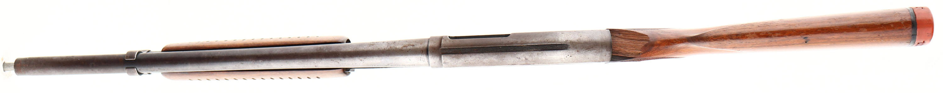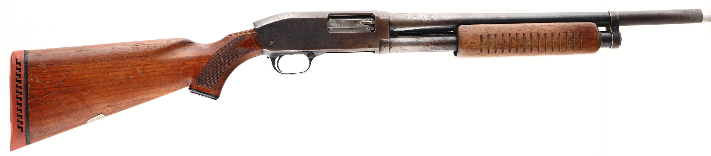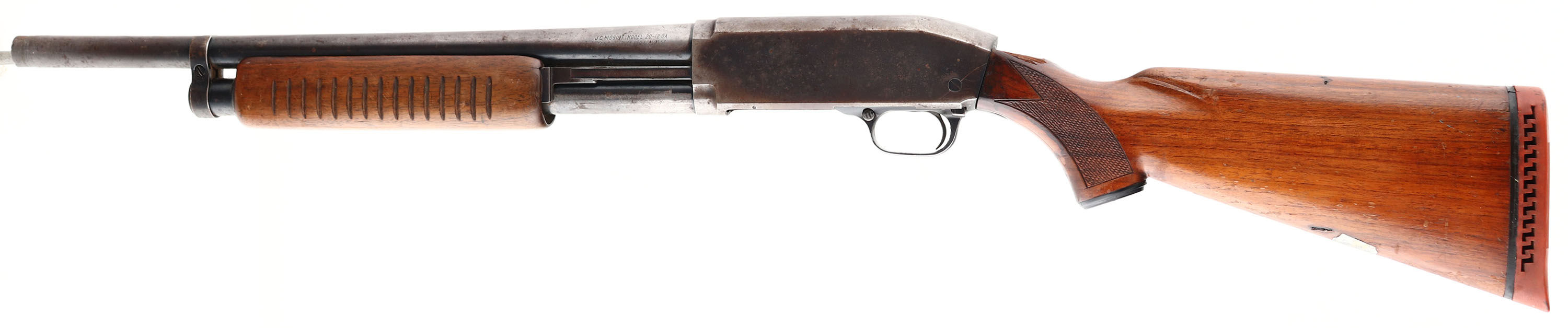 J.C. Higgins, Model 20, CAL: 12 GA, MFG: 1946-61, SN: None, Pump Action Shotgun, Choke Full, 2 3/4'' Chamber, 19'' barrel. The original capped pistol grip wood stock & forend are very good, displaying a few scrapes & scratches to the original finish. Blank silver initial shield in belly of the stock. The original metal blue finish rates 40% and thinning with speckling through out. Bore is very good. Brass front bead. Buttstock carries a factory ventilated recoil pad. LOP: 14'' overpad. FFL or C&R Req. - Value: 100 to 200
