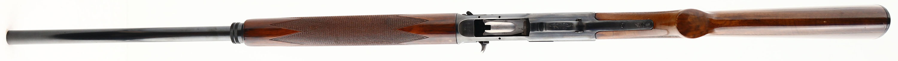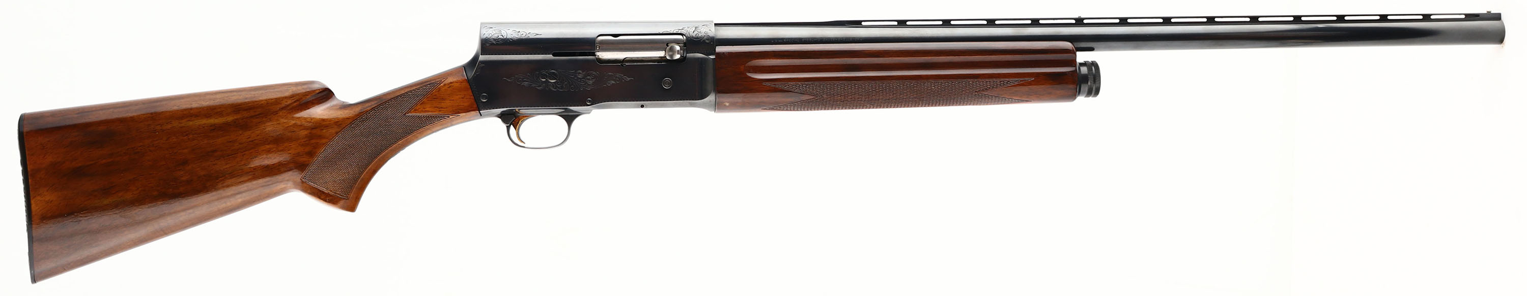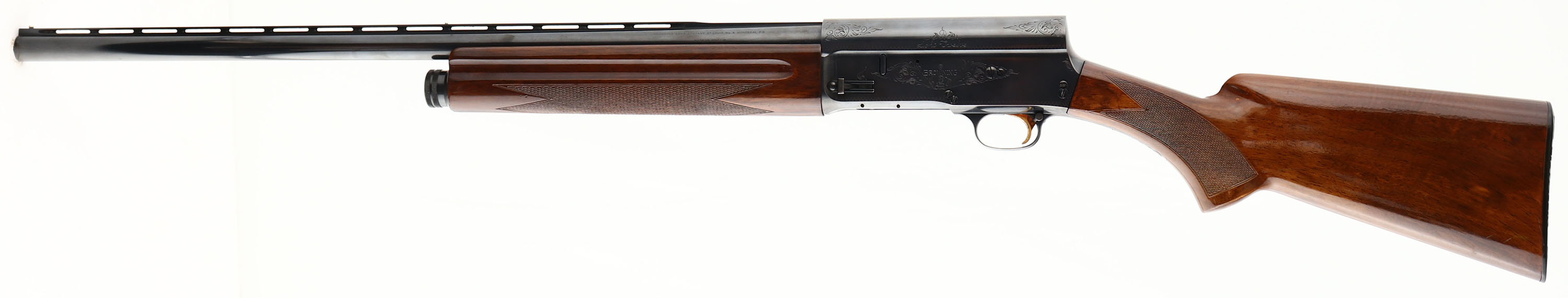 Browning, Model A5 Light Twelve, CAL: 12 GA, MFG: 1967, SN: 7G-94320, Belgium Made, Semi Auto Shotgun, 2 3/4'' chamber, MOD. Choke, 25'' Ventilated barrel. The original checkered & round knob pistol grip wood stocks are excellent, displaying very few light scratches or minor contusions to the original high gloss finish. The metal blue finish rates 95% overall & has been expertly and professional refinished, the receiver displays simple scroll, vine & border engravings. Bore is excellent & bright. The ventilated rib holds a single front bead & a mid rib bead. Buttstock carries a FN/Browning plastic buttplate. Gold trigger. 14 3/8'' LOP. An excellent example of an all original, high condition & collectible Light Twelve. FFL or C&R Req. - Value: 1000 to 2000