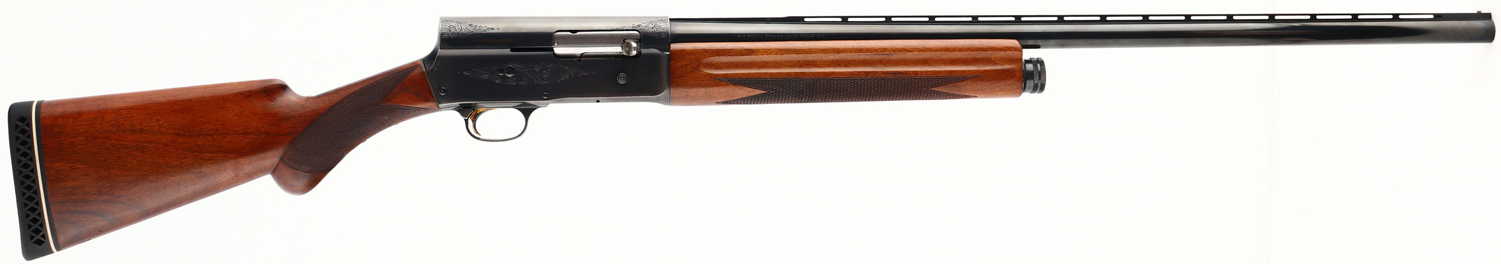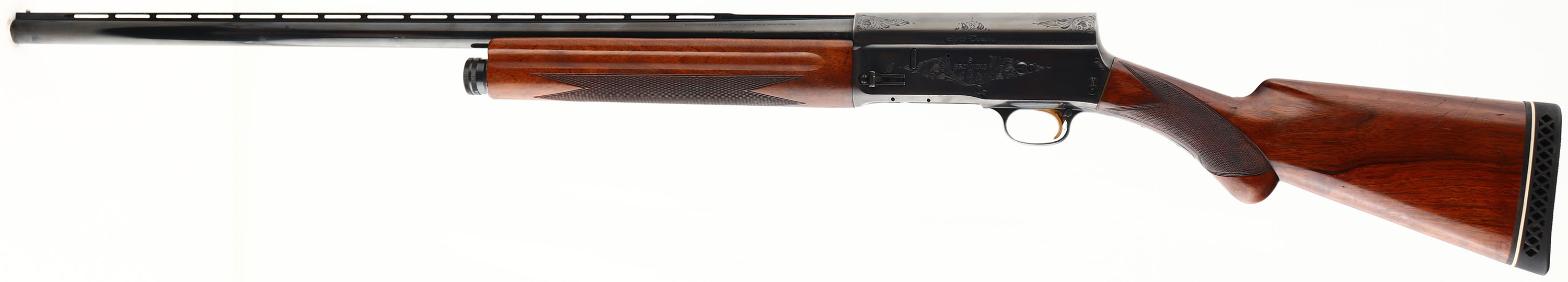 Cased Browning, Model A5 Light Twelve (TWO BARREL SET), CAL: 12 GA, MFG: 1966, SN: 61474, Belgium Made, Semi Auto Shotgun, 2 3/4'' chamber, Mod. 27 1/2'' Ventilated barrel & a Imp. 26'' Ventilated barrel . The original checkered & round knob pistol grip wood stocks are excellent, displaying very few light scratches or minor contusions to the original high gloss finish. The original metal blue finish rates 95% on the barrels, 85% on the receiver, with most of loss found on the carry points of tangs & belly on the receive. The receiver displays simple scroll, vine & border engravings. Bore is excellent & bright. The ventilated rib holds a single front bead. Buttstock carries a vent White Line buttpad. Gold trigger. 13 3/4'' LOP. An excellent example of an all original, high condition & collectible Light Twelve, Hartmann case is in excellent condition. FFL or C&R Req. - Value: 2000 to 3500
