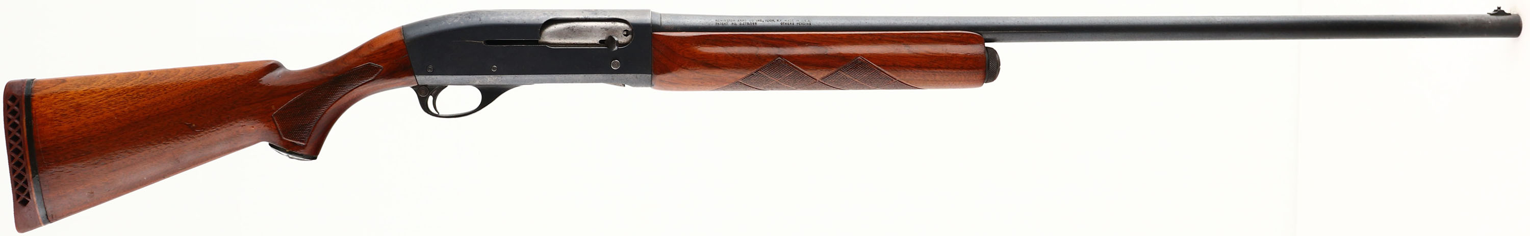 Remington, Sportsman, Model 48, 12 GA., 2 3/4'' or shorter Shells, MFG. 1950's, SN: 3021721, 30'' barrel, Semi-Auto, This is a ''C'' grade shotgun & therefore came with custom shop hand checkered high grade wood stock which has fancier grain & is excellent, original & solid, capped pistol grip, finish has an added coat of shiny finish which is good, a few small dints & scratches. Metal is at 60% blue but shows speckling through out, Bore is very good. Stock has Pachmayr vent buttpad. FFL or C&R Req. - Value: 200 to 400