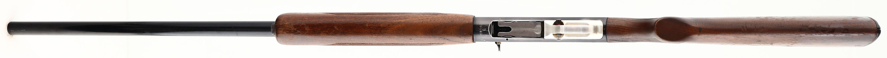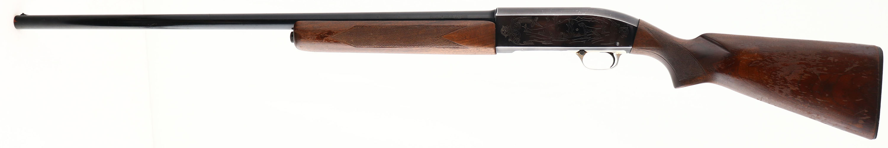 Winchester, Model M59 WIN-LITE, 12 Ga, MFG. 1959-65, SN: 10643, Semi Auto, 3 Shot Shotgun, 2 3/4'', Full, Choke, 30'' fiberglass barrel with silver bead front sight (they used fiberglass lined barrels to cut weight), The checkered & flat pistol grip stocks are very good, with numerous minor nicks, dings & contusions to the original finish, the fiorend has a 2'' crack on the left side. The anodized black finish is 90% on the steel/fiberglass barrel & alloy metal receiver, with several minor scratches on the machine engraved receivers. Bore is excellent. Winchester factory checkered buttplate. FFL or C&R Req. - Value: 200 to 400