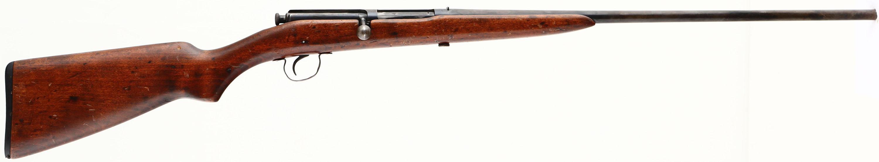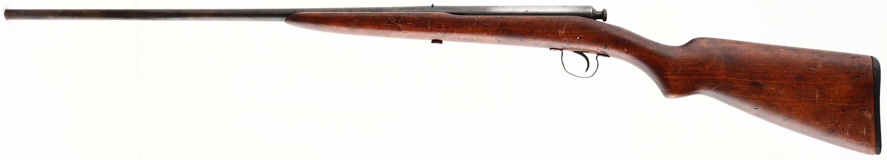Winchester, Model 41, CAL; 410, MFG: 1920-34, SN: NONE, Bolt Action Shotgun, 22 3/4'' barrel. The refinished flat pistol grip stock is good & solid. There are numerous smoothed blemishes throughout, with added finish. The metal blue finish on the barrel & receiver is a mix of original blue, applied brown finish & areas worn to metal gray. Bore is excellent. Fixed rear sight, no front sight. Winchester checkered plastic buttplate that's worn smooth & has a small toe chip. FFL or C&R Req. - Value: 100 to 300