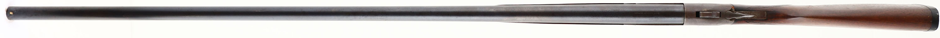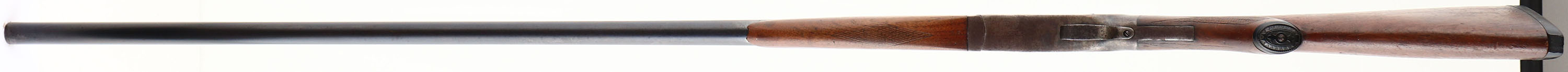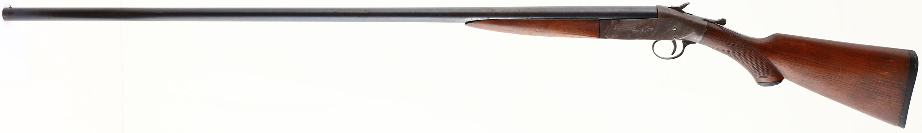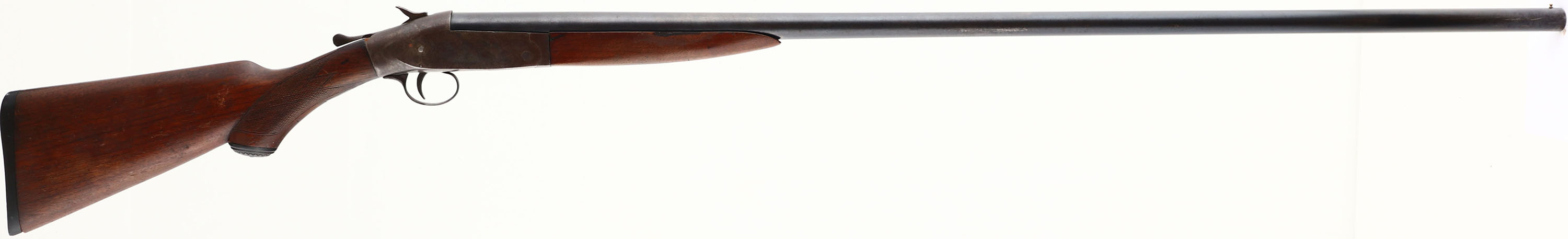Crescent Tool Company, Long Tom, CAL; 12GA, MFG: 1908-16, SN: 65949, Break Action Single Shot Shotgun, 40 1/8'' barrel. The checkered capped pistol grip stocks are good & solid. There is a small crack coming off the upper tang, forend tip edge chip, scrapes & other minor blemishes. The metal blue finish on the barrel rates 60%, with consistent spotting & thinning toned to a brown patina. The case-hardened receiver has remnants of case-colors, but mostly worn to metal gray & toned to a brown patina. Bore is excellent. Brass bead front sight. Checkered plastic buttplate with toe chip. FFL or C&R Req. - Value: 200 to 400
