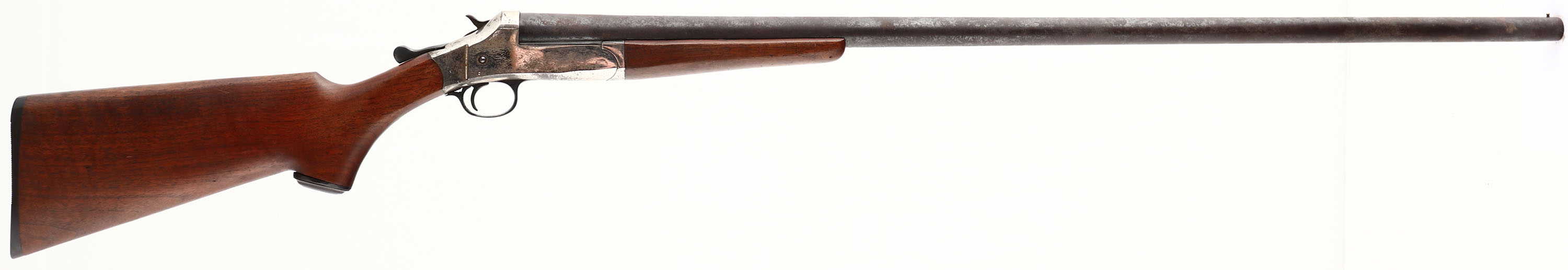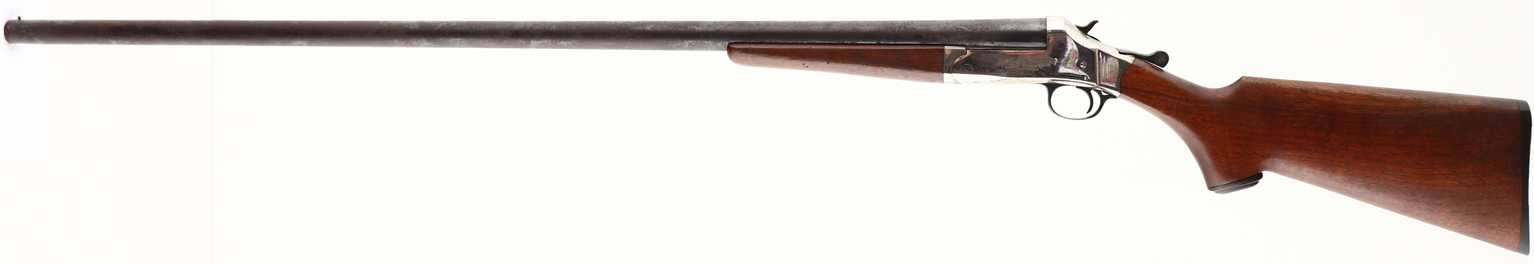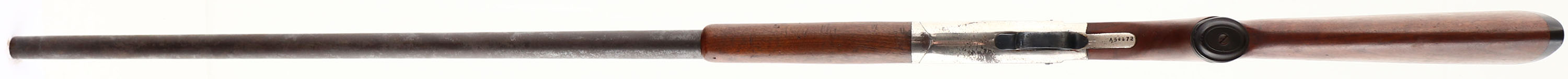 Belknap Hardware Co., Nitro Hunter, CAL: 12GA, MFG: 1890's-1930's, SN: A58472, Break Action Single Shot Shotgun, 36'' barrel. The capped pistol grip wood stocks are excellent. There are contusions & dings, mostly to the forend. The metal blue finish on the barrel has fully toned to a brown patina with consistent pitting throughout & the nickel finish on the receiver rates 60-70%, with consistent spotting throughout, toned to a brown patina. Bore is excellent. Brass bead front sight. Grooved plastic buttplate. FFL or C&R Req. - Value: 100 to 300